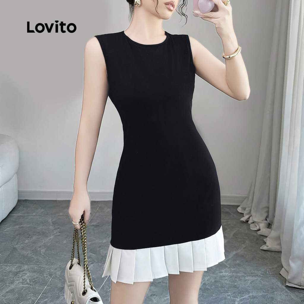 Lovito Tecido para Vestido Casual Costura Plissado Primavera/verão Vestido Preto e branco L155ED528