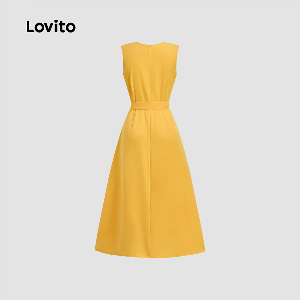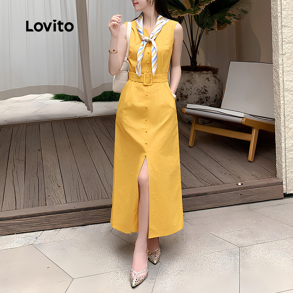 (New) Lovito Vestido Casual de Botão para Primavera/verão Amarelo para mulheres LBL28341
