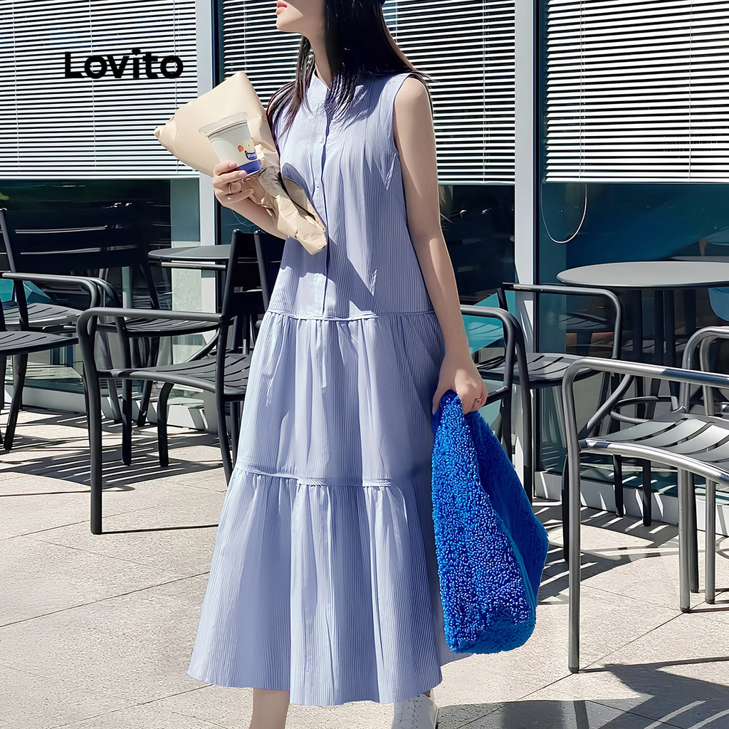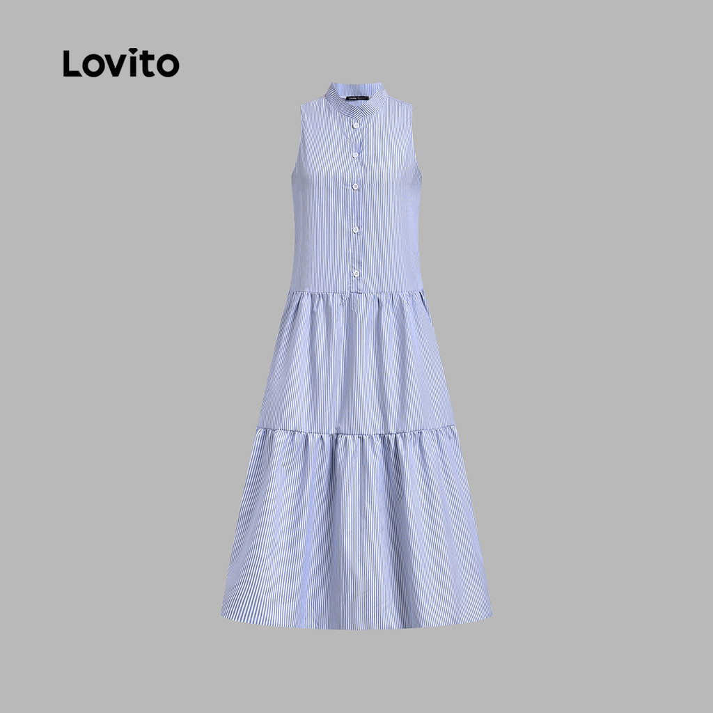 Lovito Vestido Casual Listrado Em Camadas Com Botão Primavera/Verão Azul Para Mulheres L134LD048