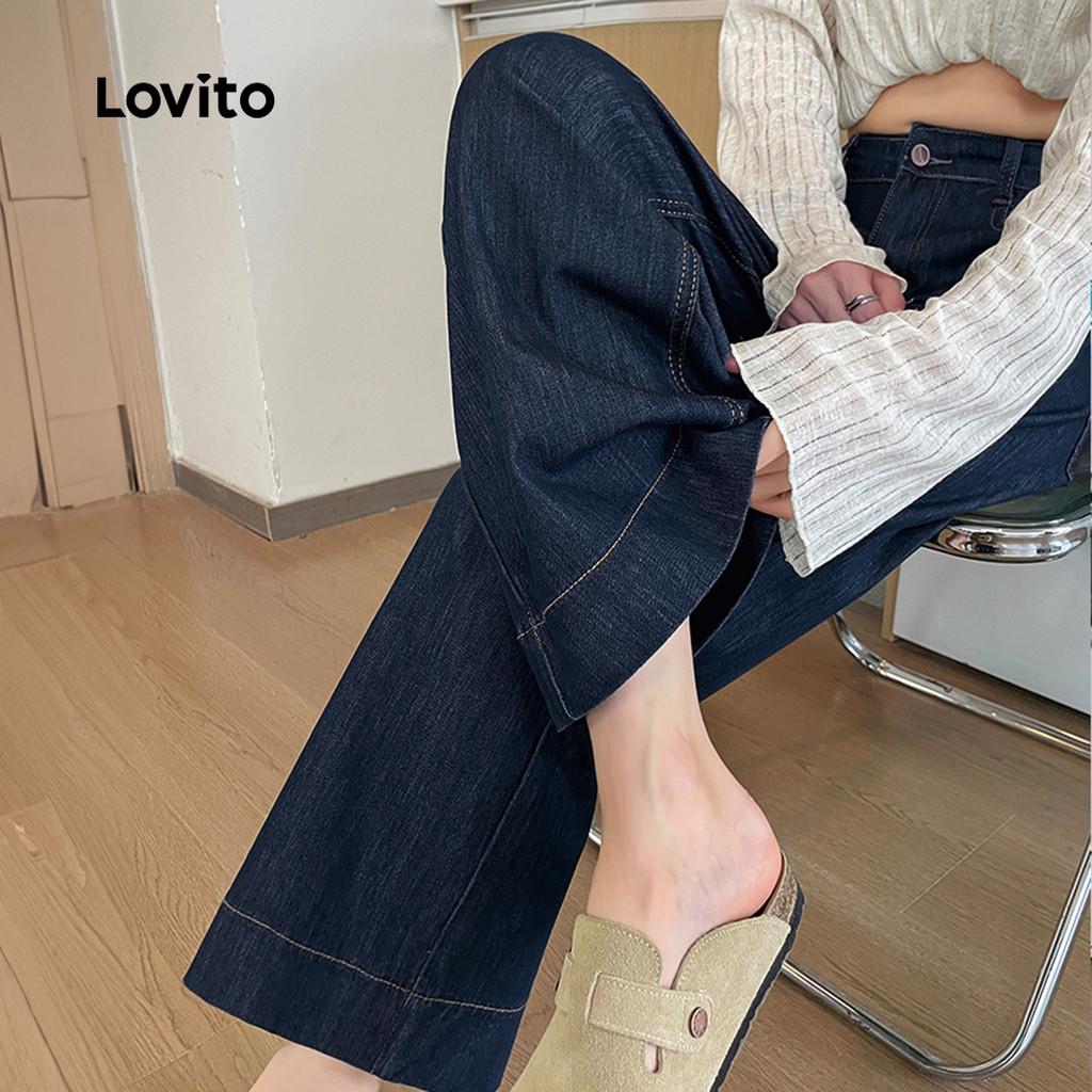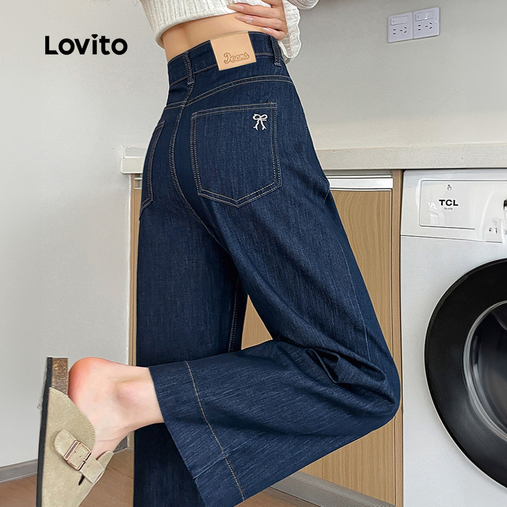 Lovito Jeans Feminina Calça Casual Bordada com Bolso Laço Larga e Solta Azul Escuro L135AD1218
