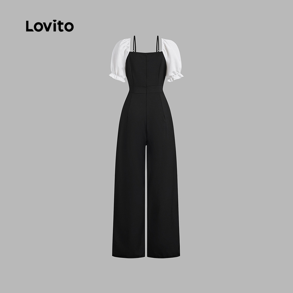(NEW) Lovito Macacão Elegante com Alças Ajustáveis para Primavera/verão Preto para mulheres L150ED456