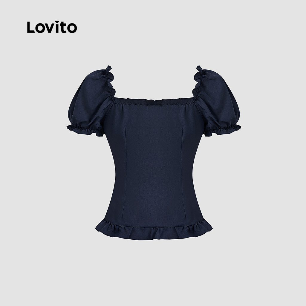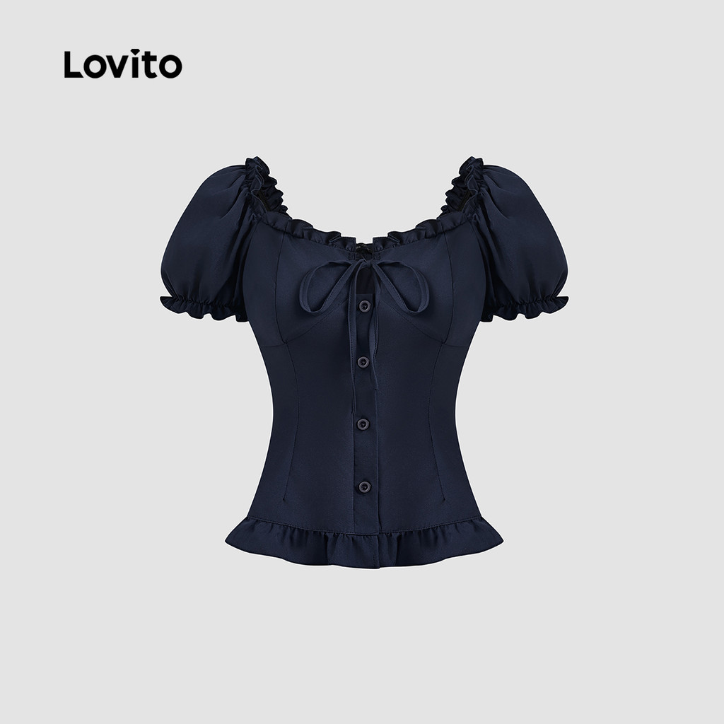 (NEW) Lovito Blusa Casual com Babado Primavera/verão Blusa Azul-marinho para Mulheres L156AD085