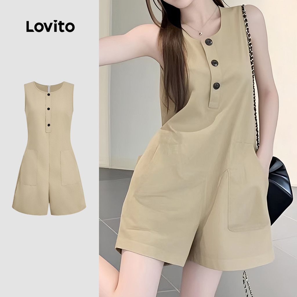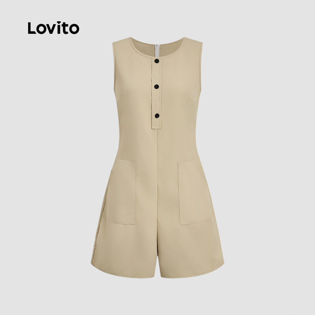 Lovito Macacão Feminino Casual com Botões e Bolsos Primavera/Verão Caqui L137ED067