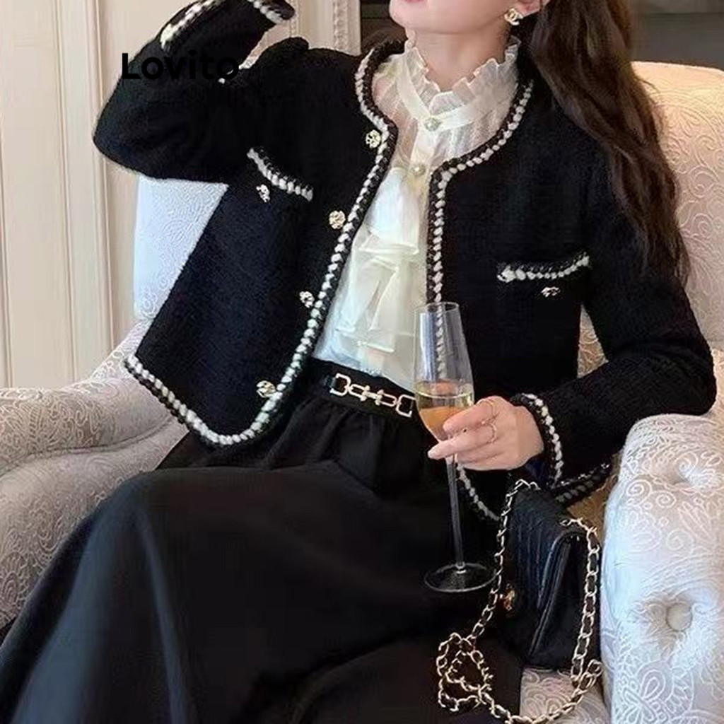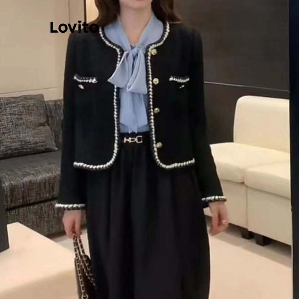 Blazer Lovito Feminino com Bolso Liso e Acabamento Contrastante, Modelo Casual, Cor Preto - LNA29012