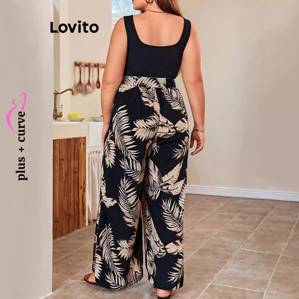(Trendy) Lovito Macacão Plus Size Curve Elegante Tecido Tropical Costura Plus Size para Mulheres LNL91059