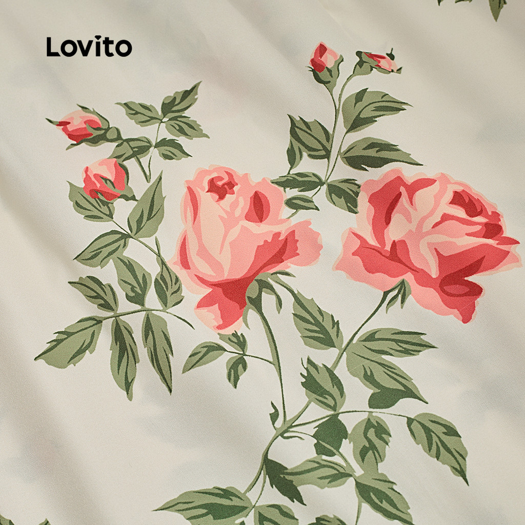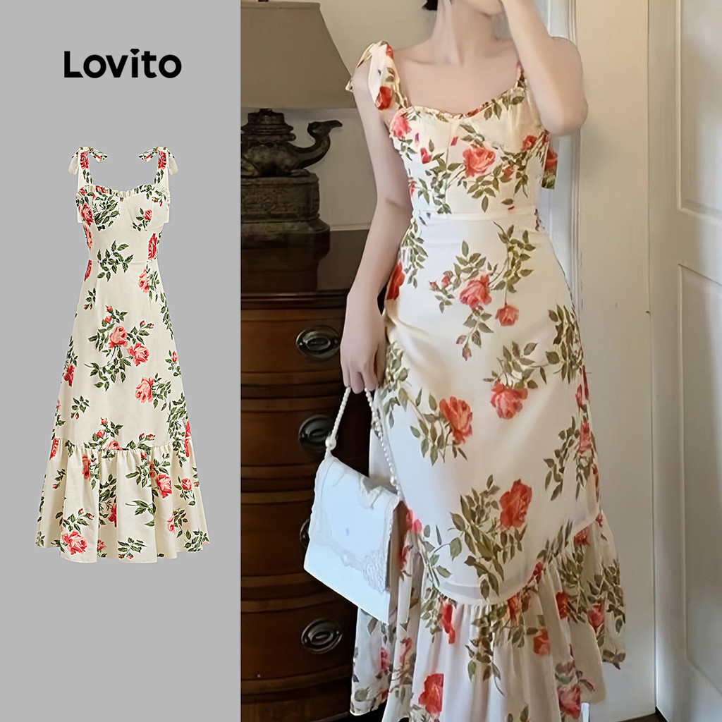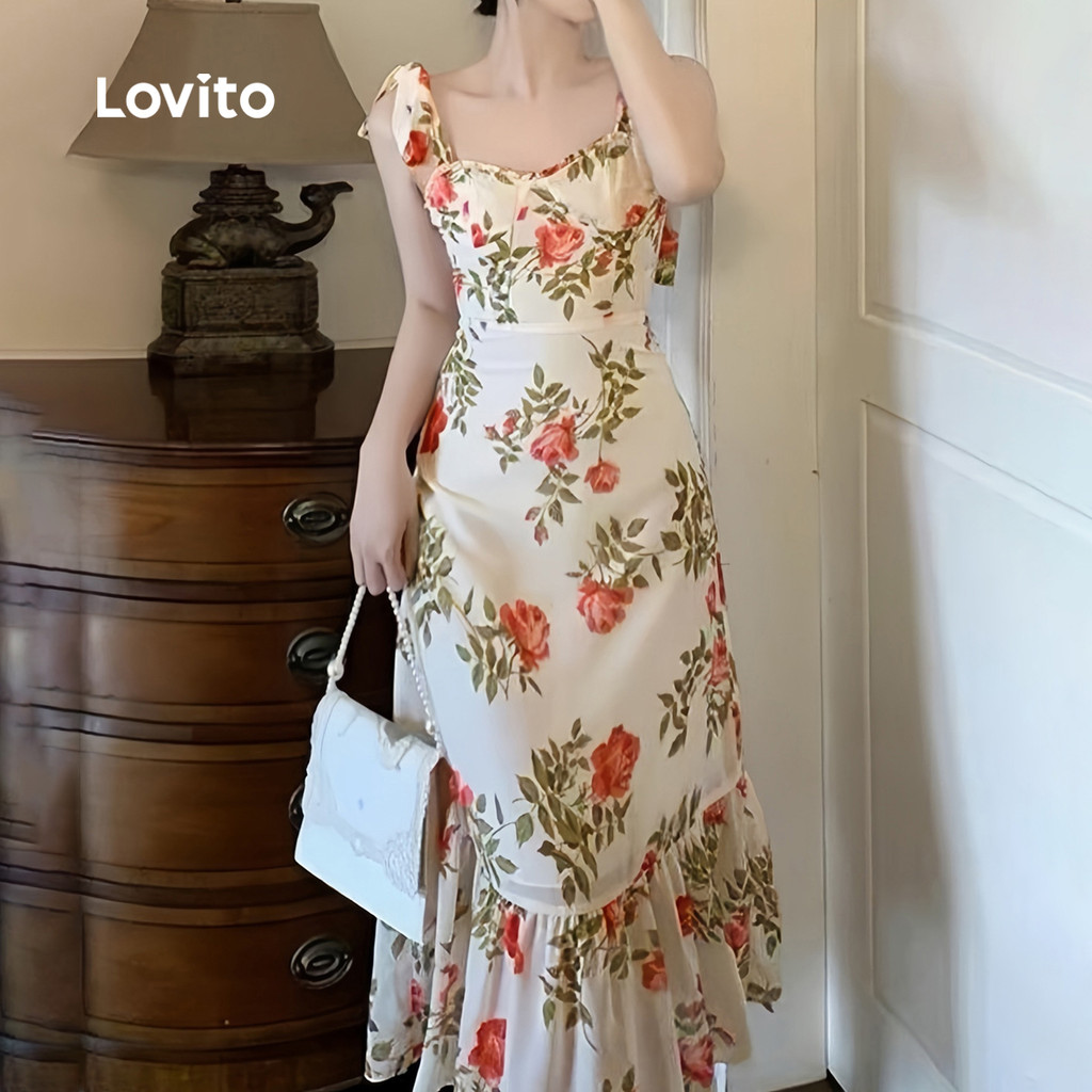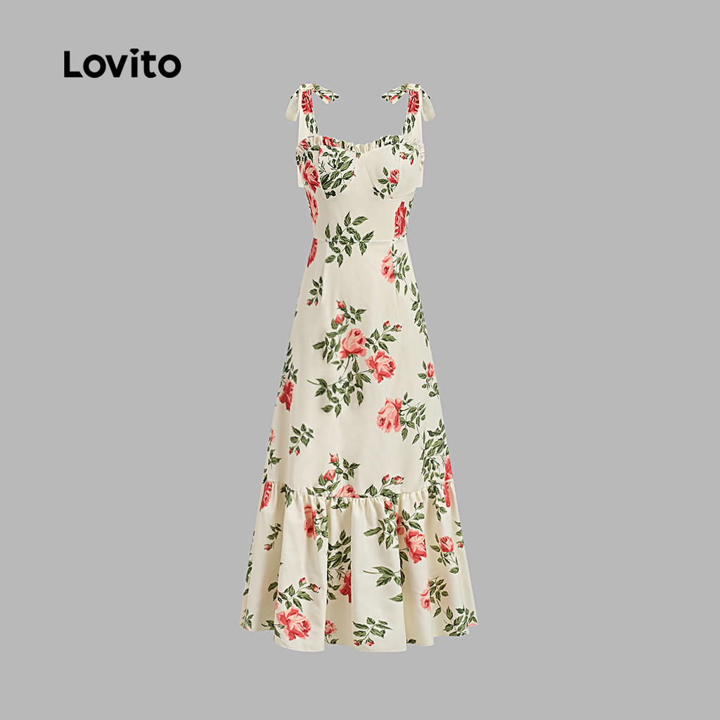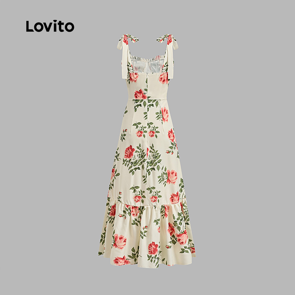 (New) Lovito Vestido Boho de Renda com Amarrar Bainha Covinha e Babado Vestido Primavera/verão para Mulheres L142ED171
