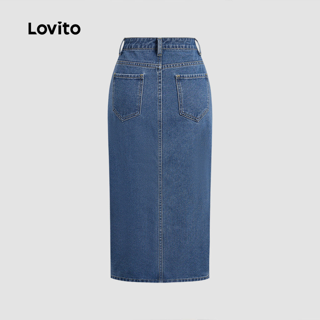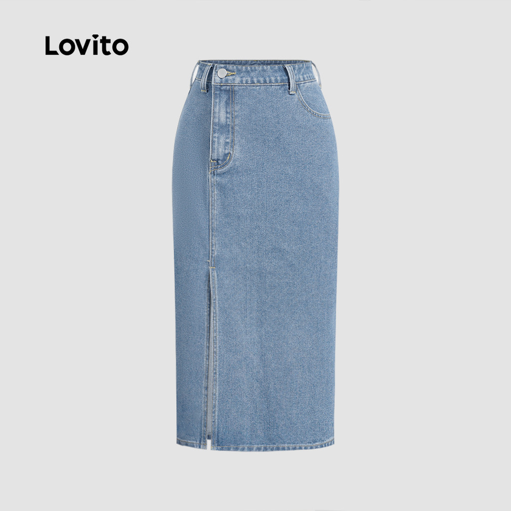 Lovito Saia Jeans Casual com Fenda Assimétrica Bolso Primavera/verão Saia Jeans Azul para mulheres L142ED172