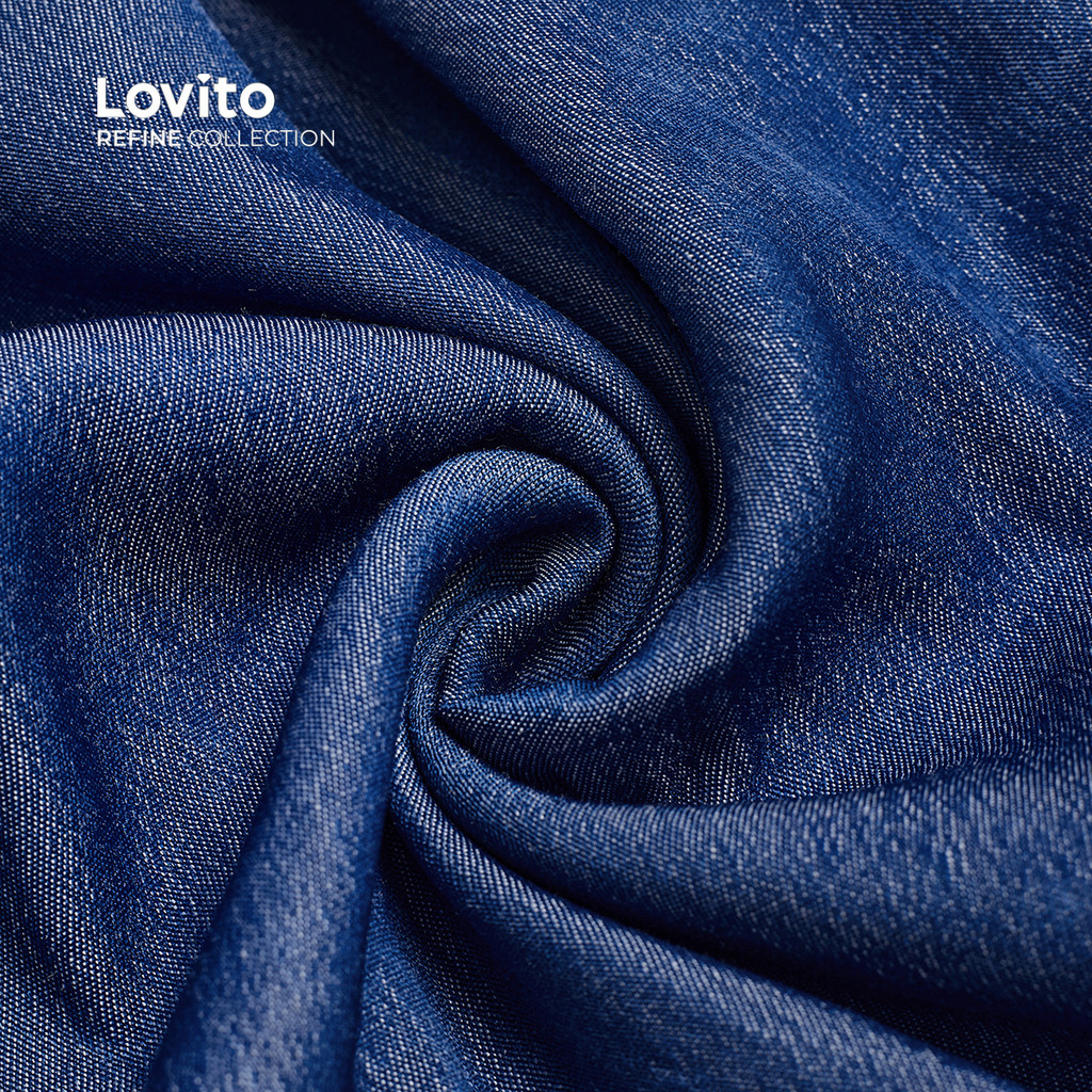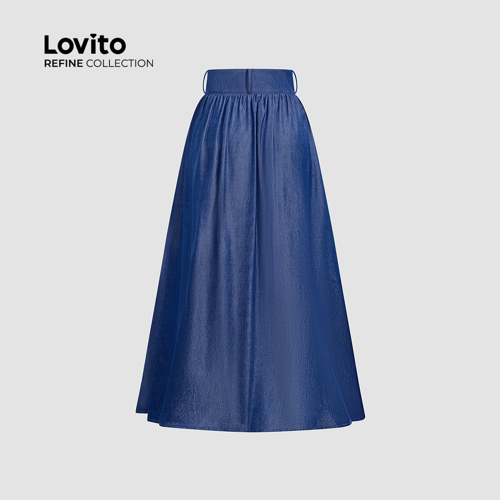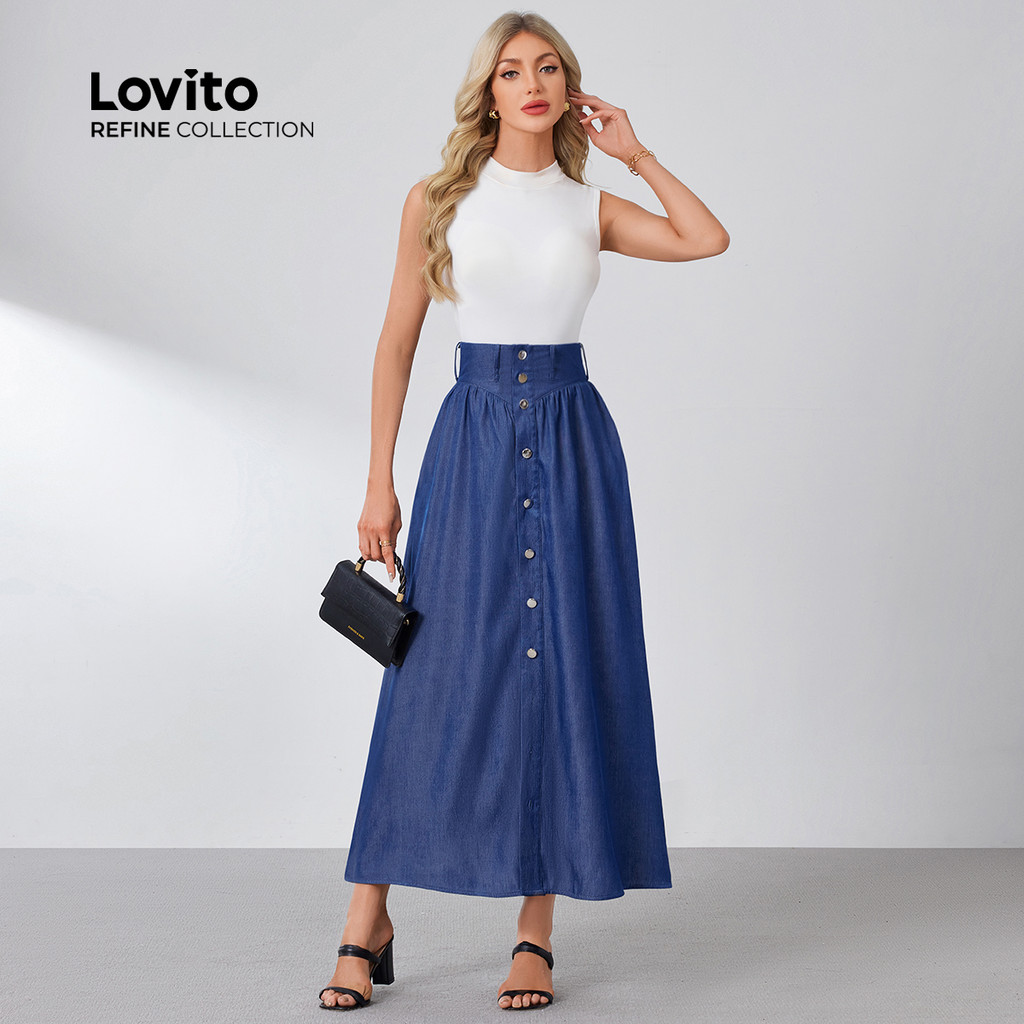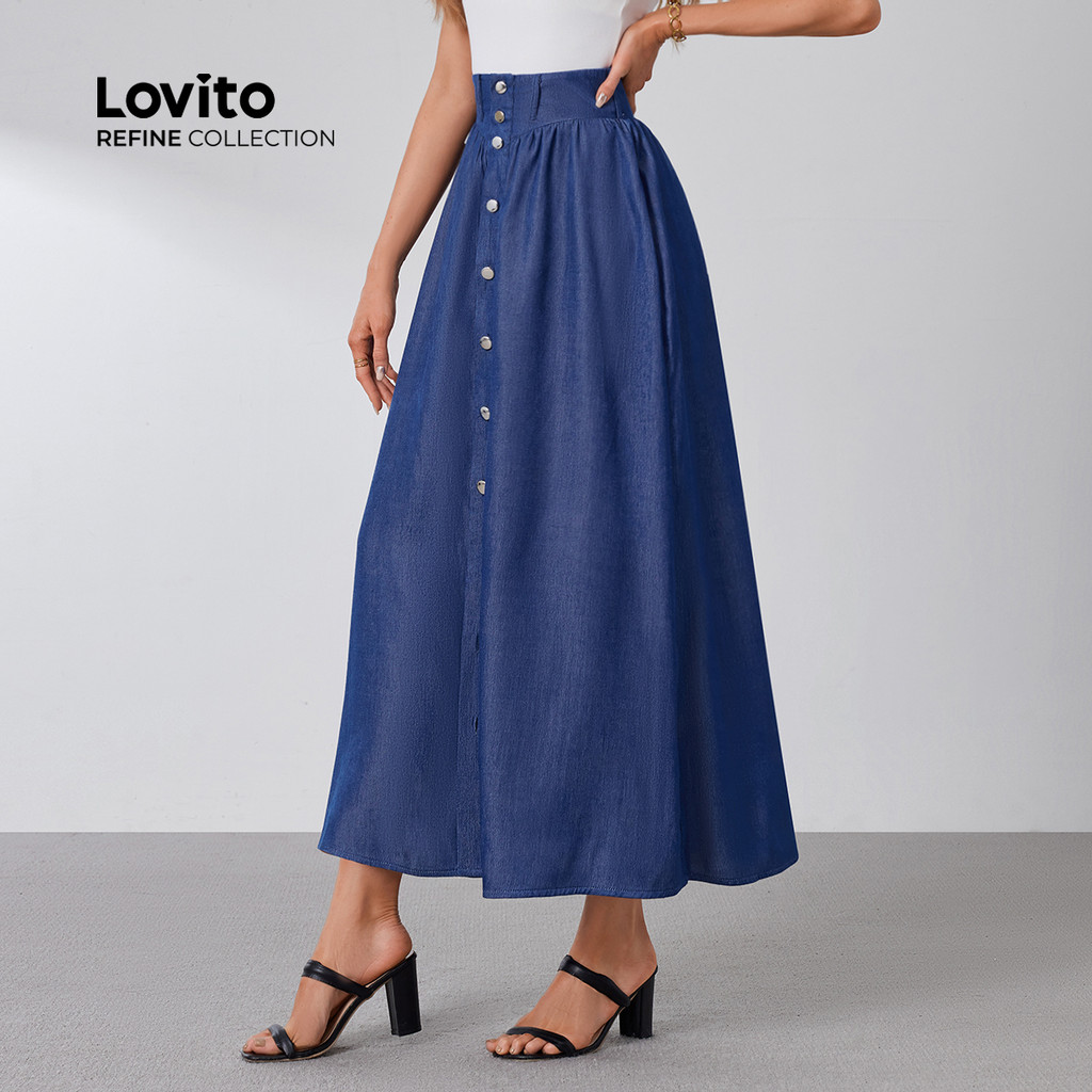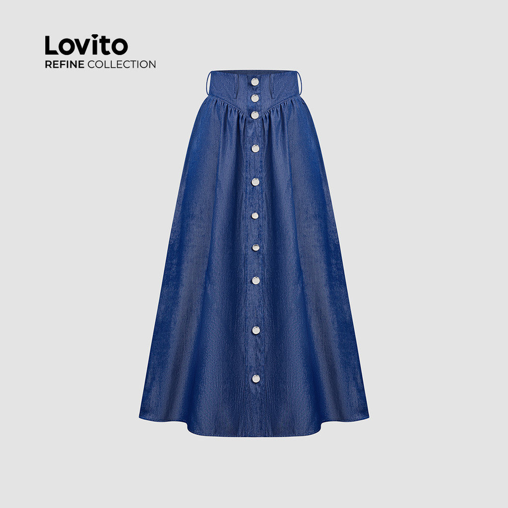 (New) (Lovito Refine) Saias de Jeans Elegantes com Botões Na Frente Metal Primavera/verão azul-marinho LR18L009