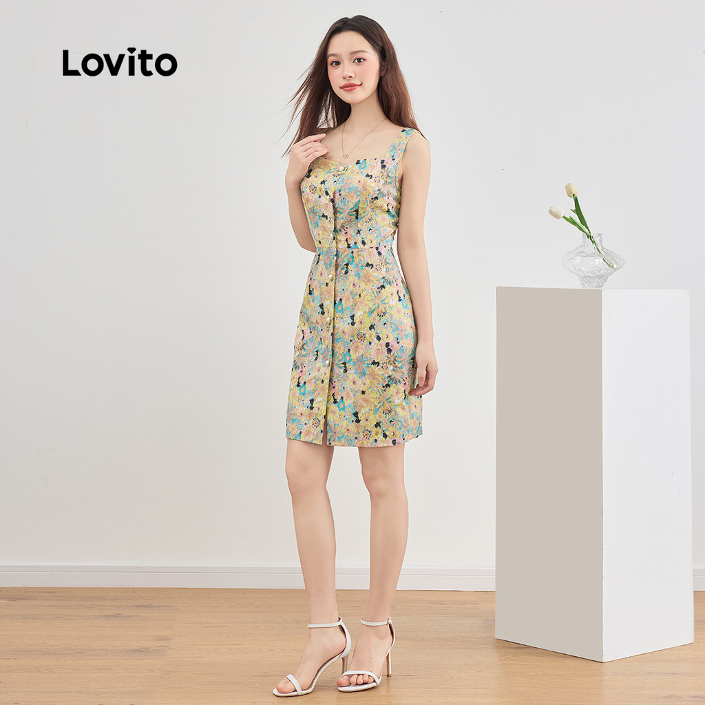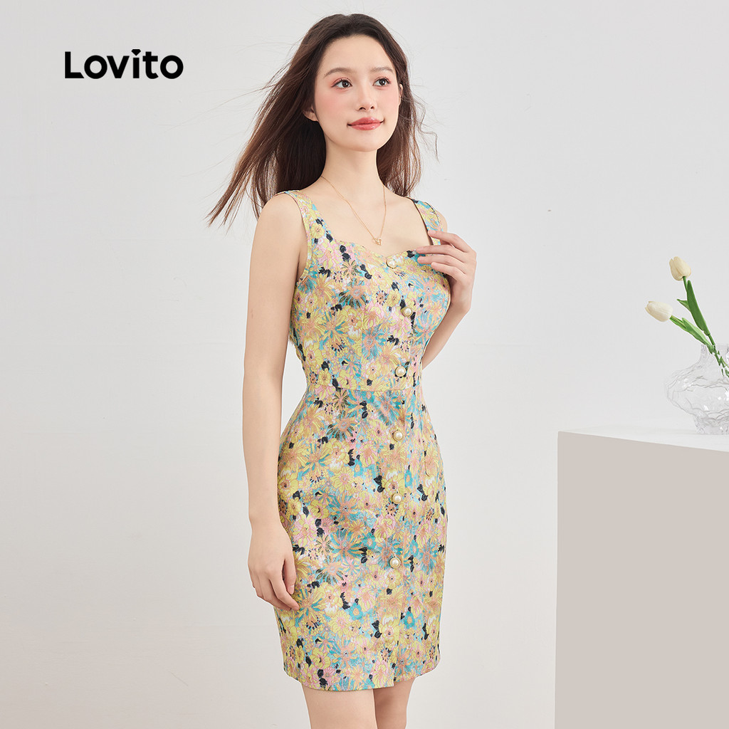 (Trendy) Lovito Vestido Boho Floral com botão frontal para mulheres L129AD1407