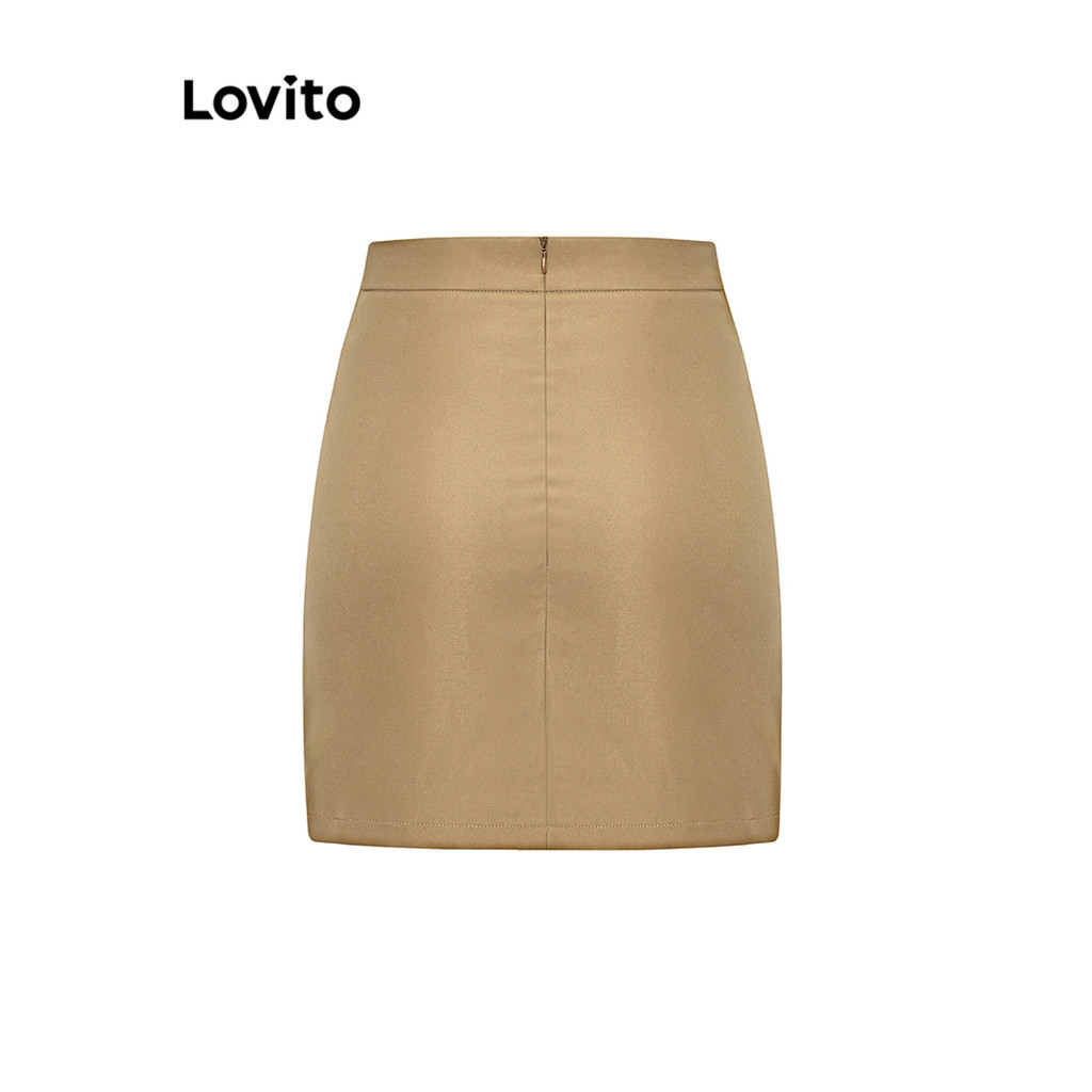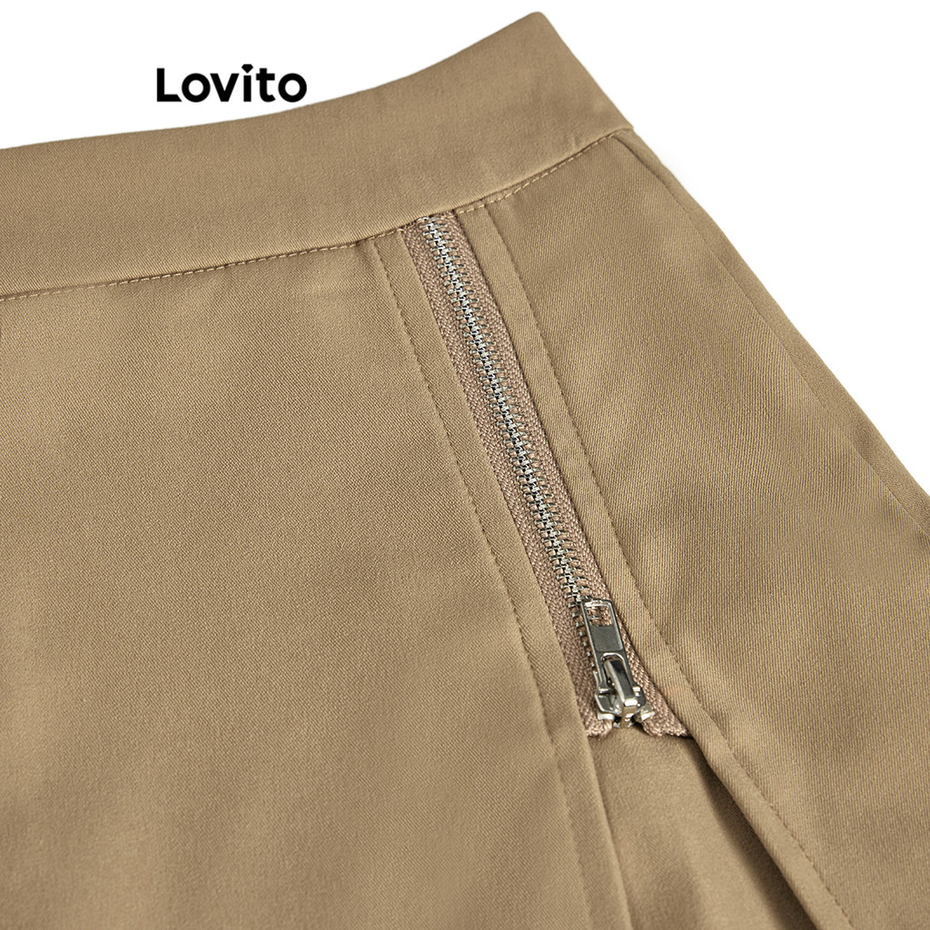 Lovito Shorts Casuais Femininos Com Zíper Divisão Estilo Preppy L59ED161 (Cáqui)