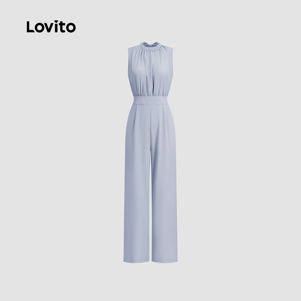 Lovito Macacão Elegante Liso Franzido Verão Primavera Cinza Azul Macacão Para Mulheres L134ED420