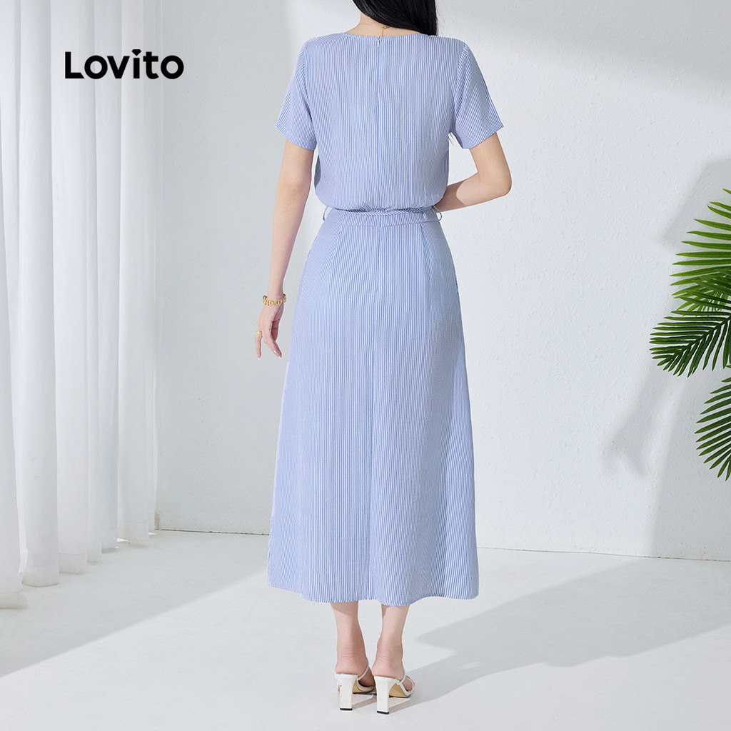 Lovito Refine Vestido Feminino Azul Casual Primavera Verão com Detalhes em Renda e Amarração L154LD358