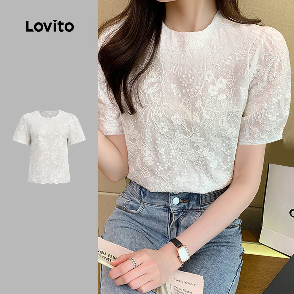 (Trendy) Lovito Blusa Boho com Bordado em Tule e Jacquard Primavera/verão Branca para mulheres L138ED252