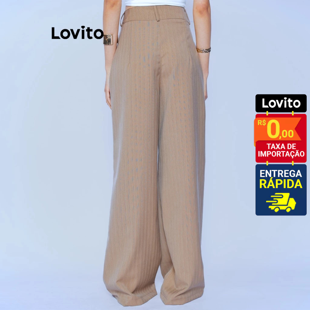 Lovito Calça Alfaiataria Feminina Wide Leg Cintura Alta Marrom Elegante para Trabalho e Dia a Dia