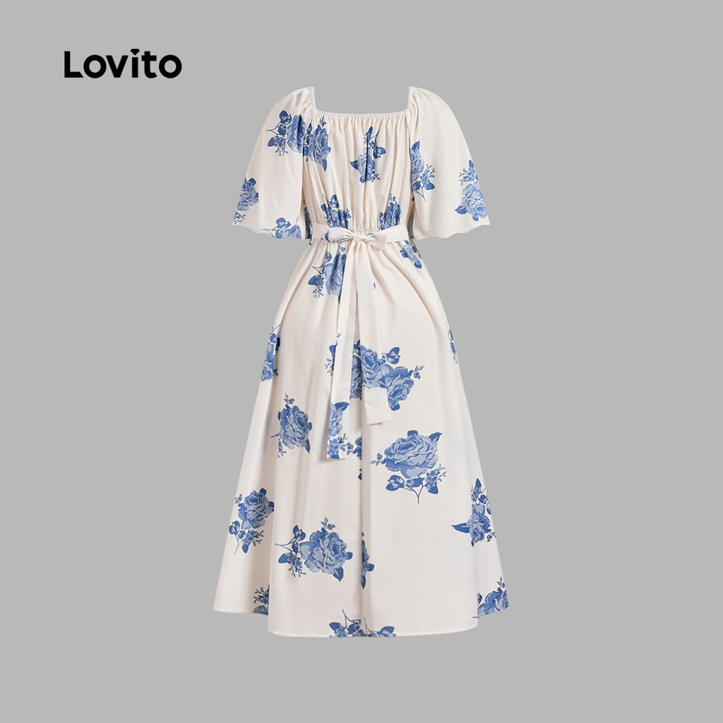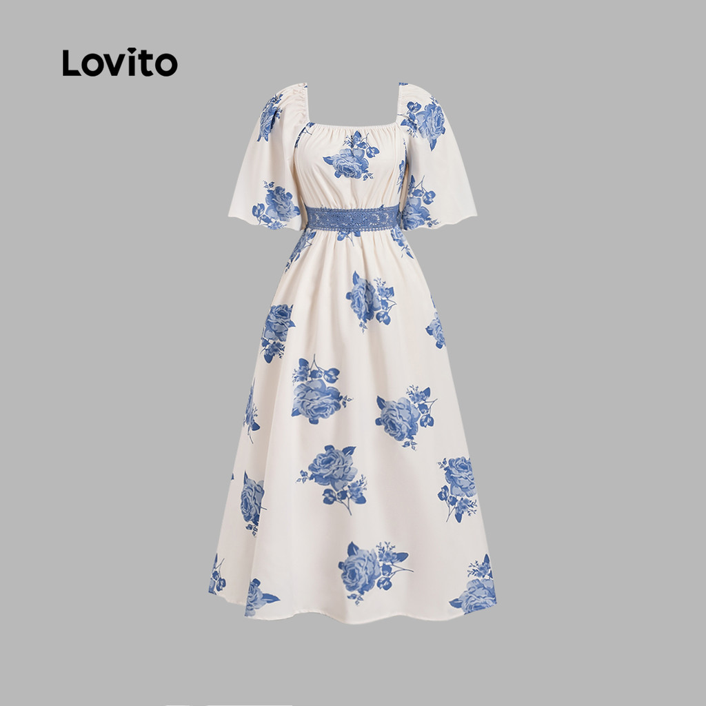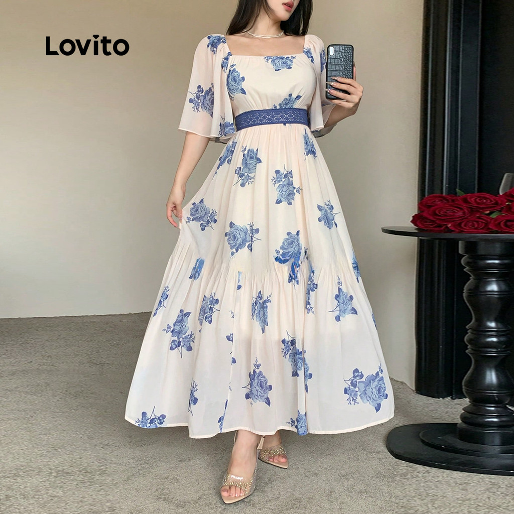 Lovito Vestido Boho Feminino com Renda em Bloco de Cores Azul e Branco para Primavera/Verão LBL27028