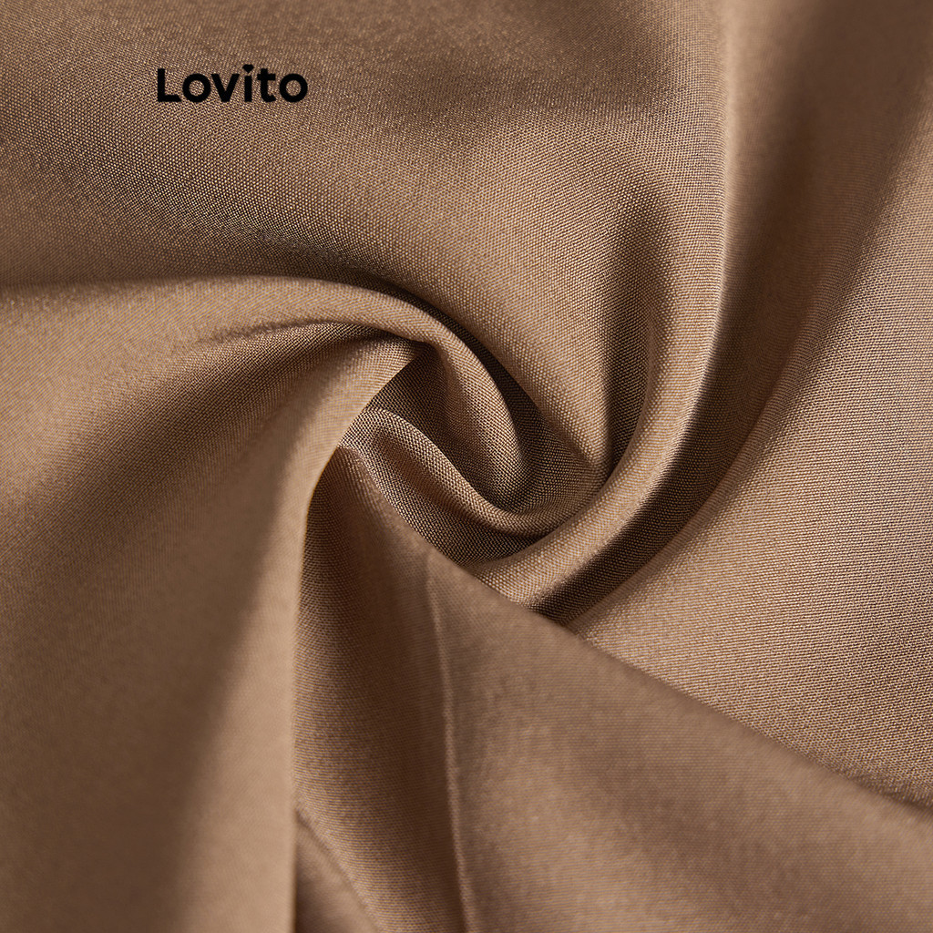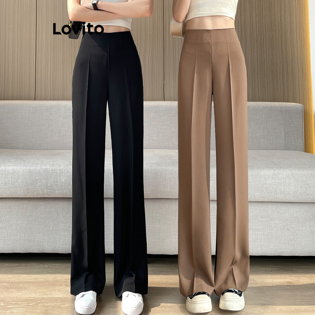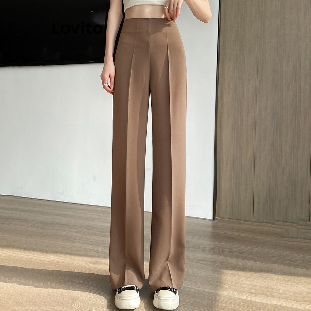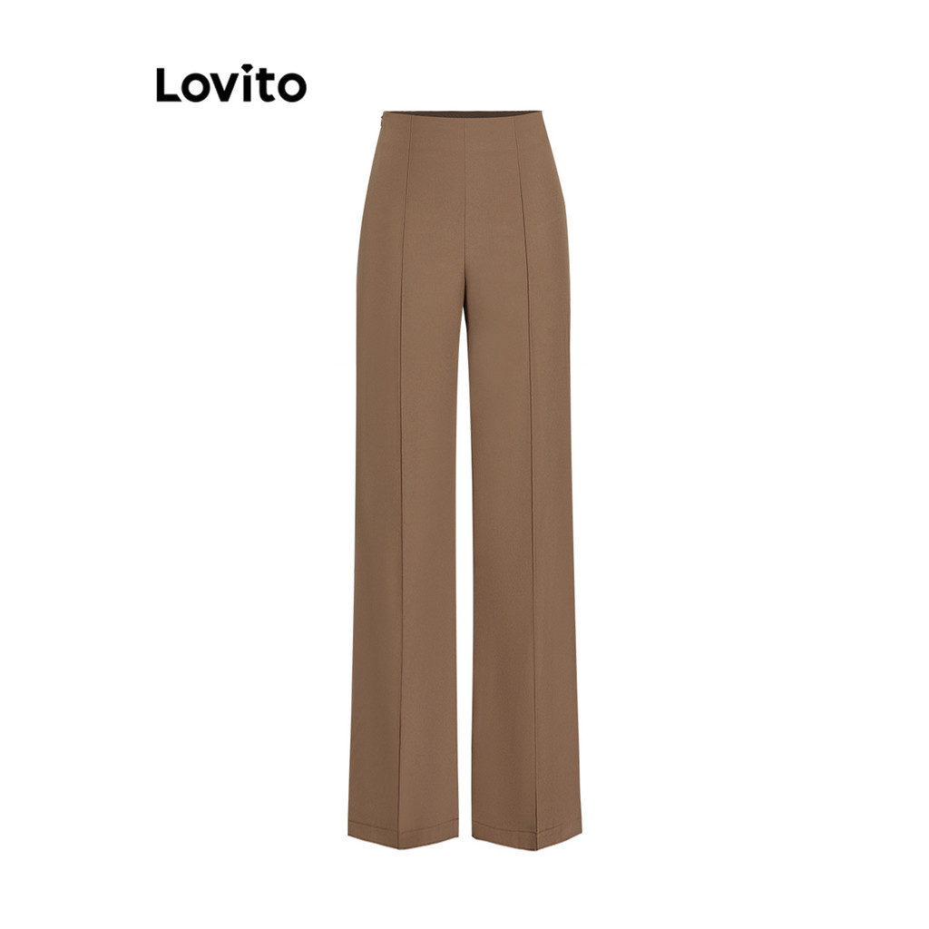 Lovito Calça Casual Feminina Lisa com Pintucks - L68ED317 (Cáqui/Preto)