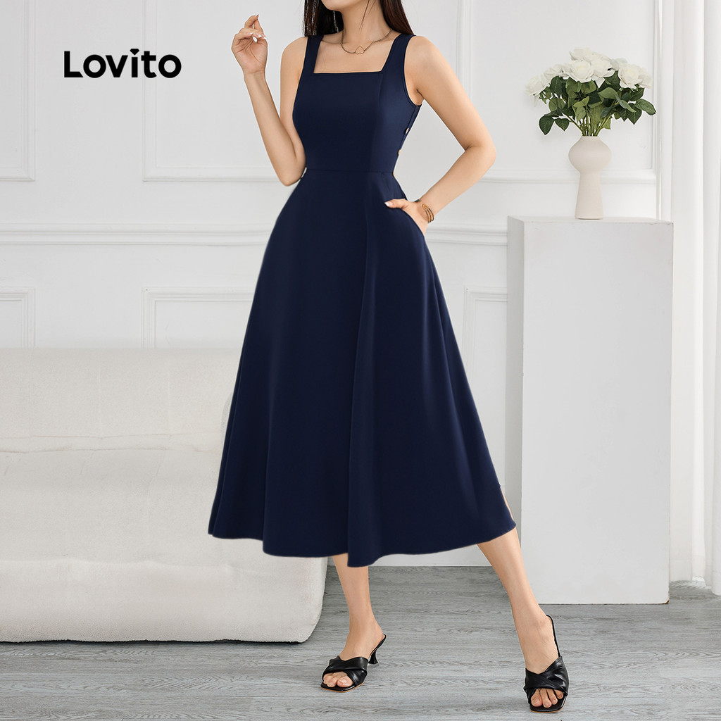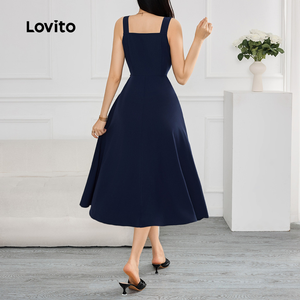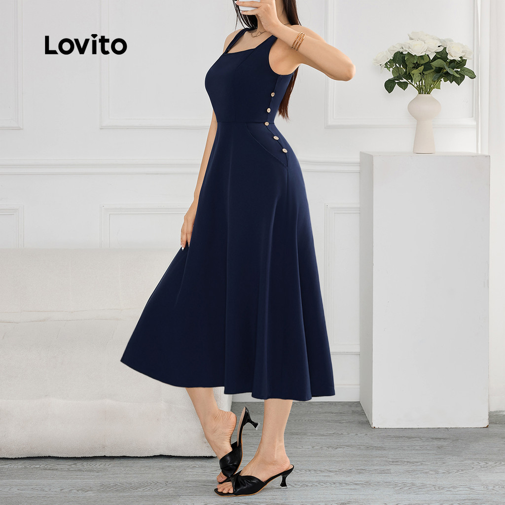Lovito Refine Vestido Azul Marinho de Bolso com Botões para Primavera Verão LBL26228