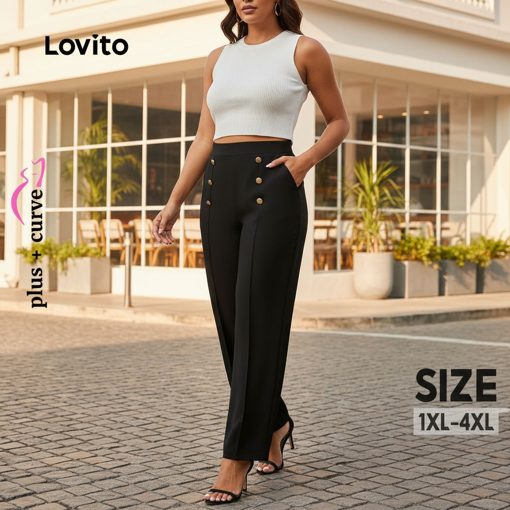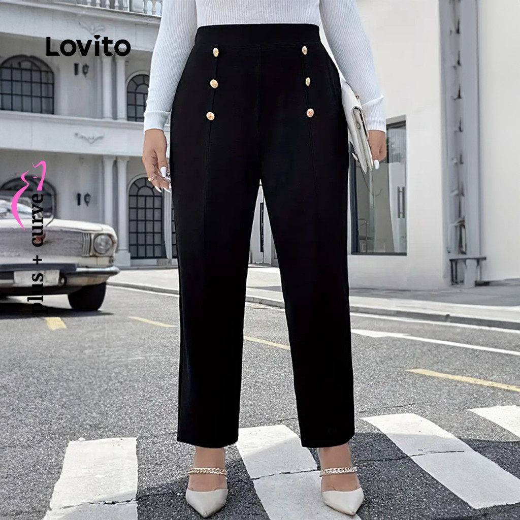 Lovito Plus Size Curvas Calça Feminina Azul Escuro Botão Simples Conforto Elegante LNE103028