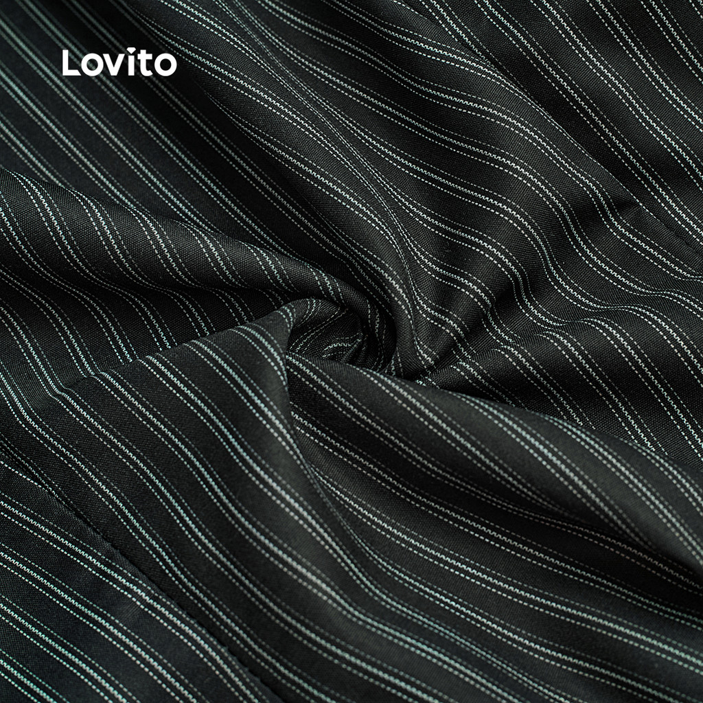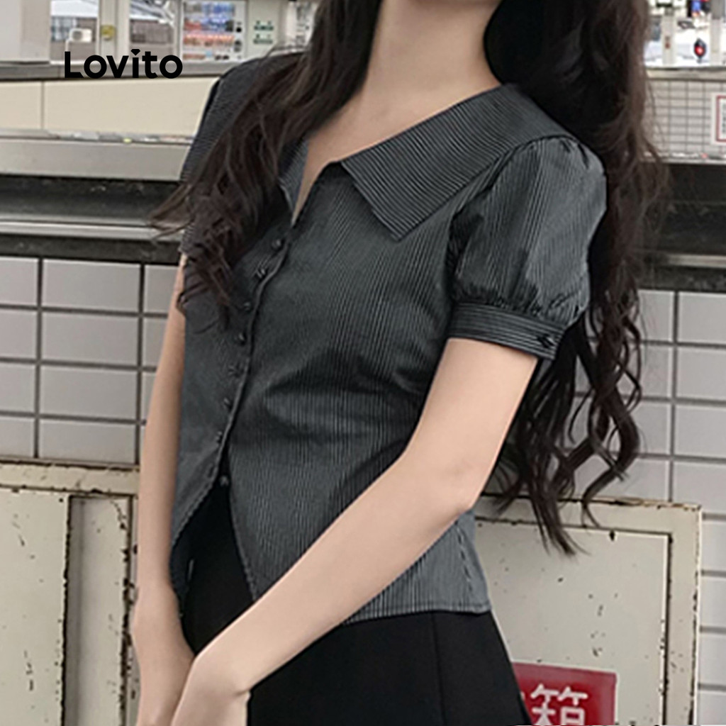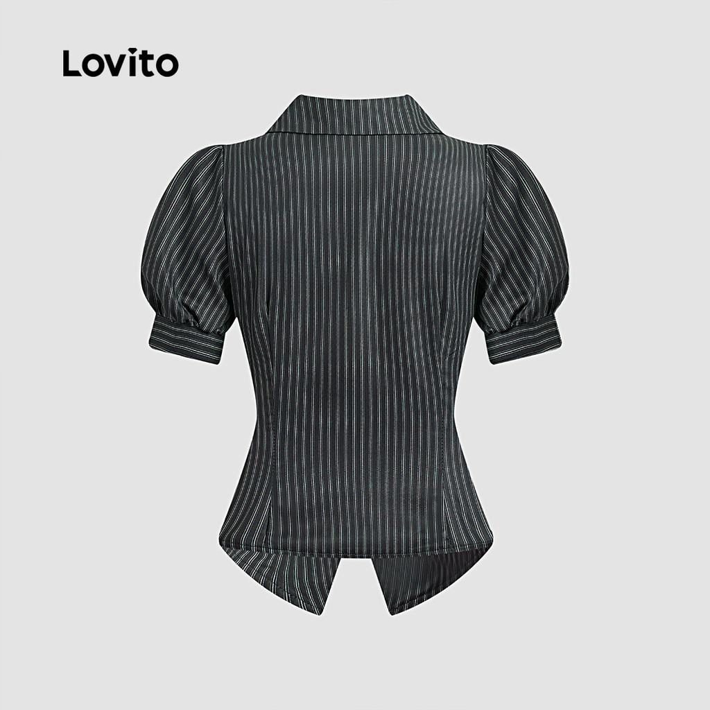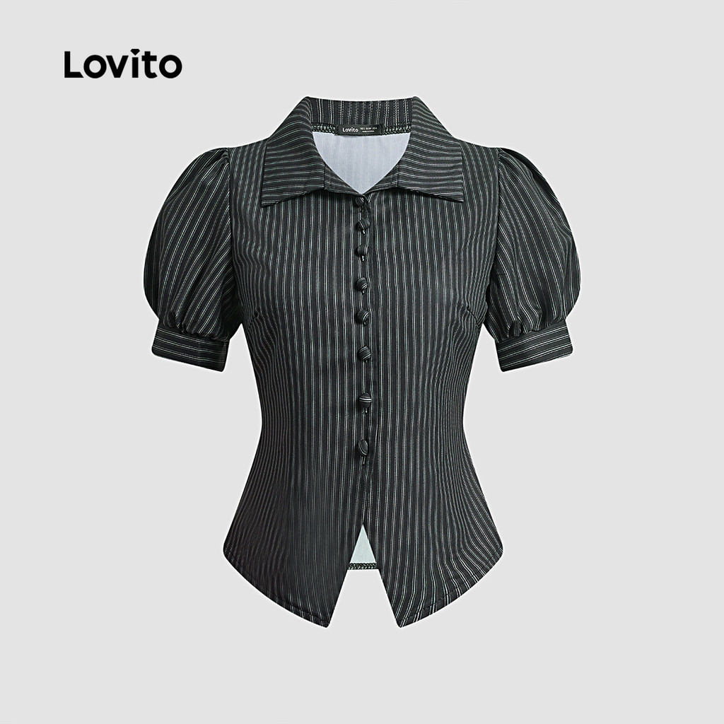 Lovito Blusa Casual Listrada Com Botões Primavera/Verão Blusa Preta Para Mulheres L139AD251
