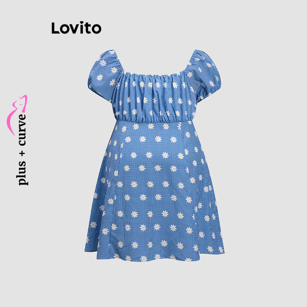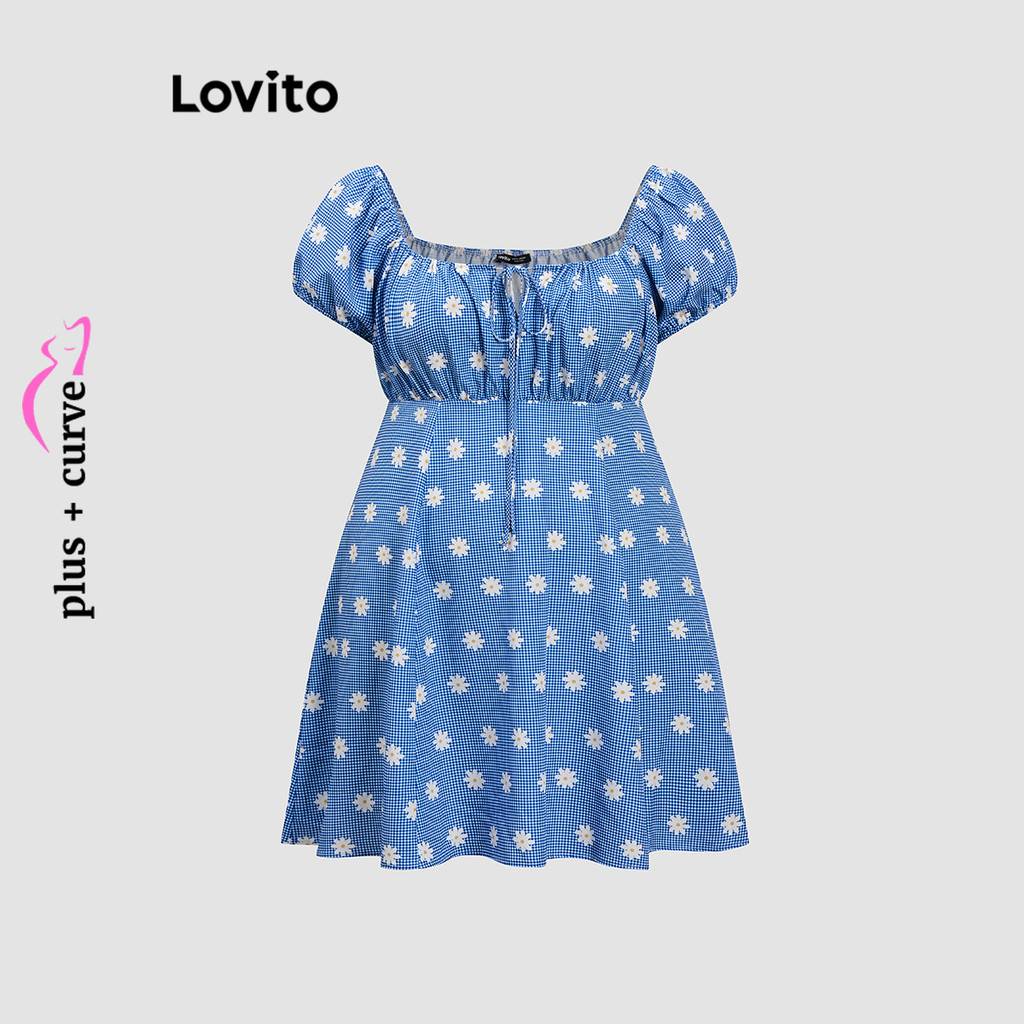 (Trendy) Lovito Plus Size Curve Boho Ditsy Floral Pattern Lace Up Vestido para Mulheres LBL18831