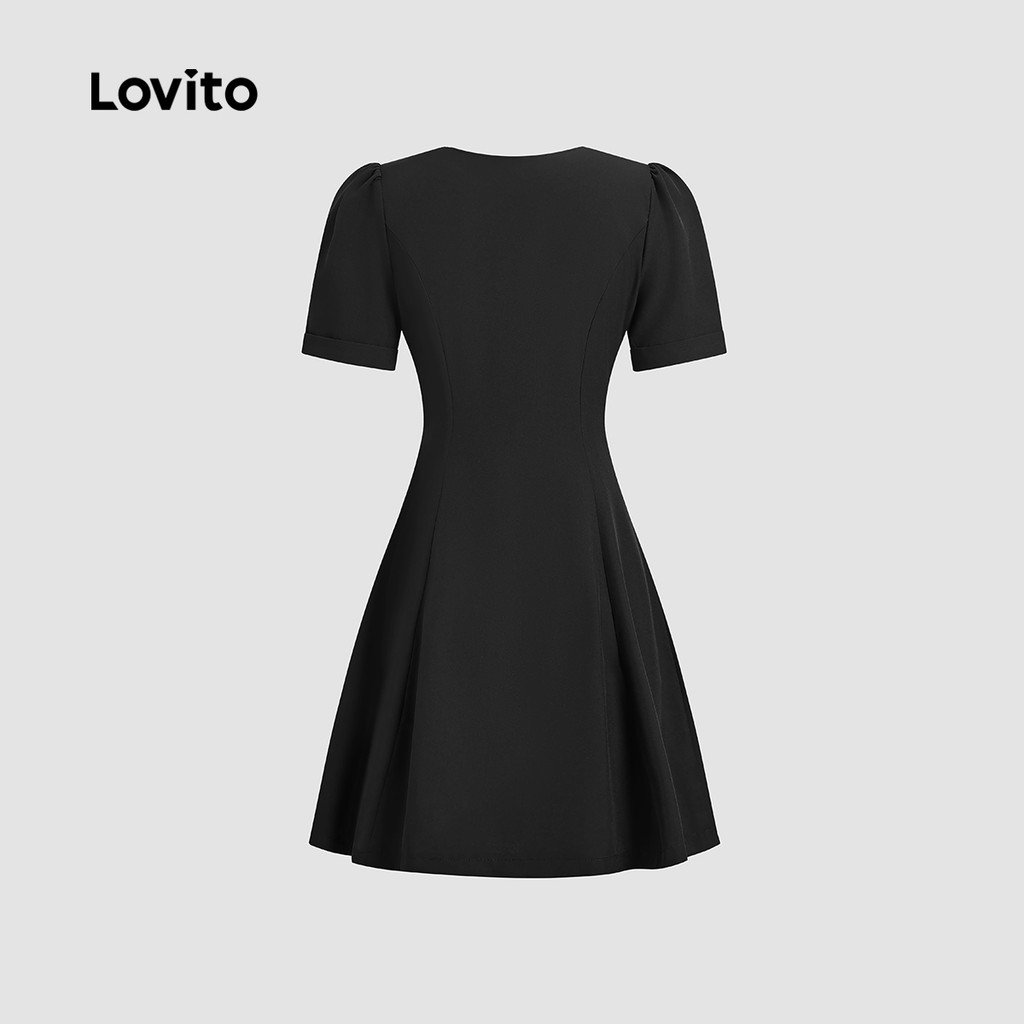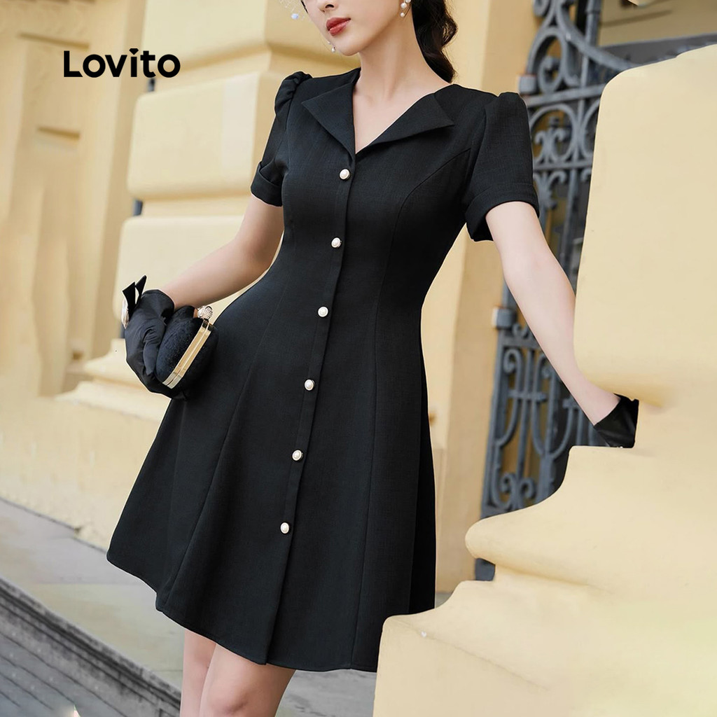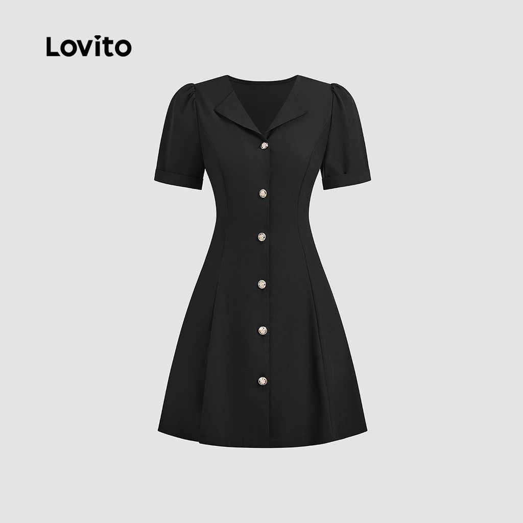 Lovito Vestido Elegante com Botões Na Frente e Fivela de Metal para Transporte Primavera/verão Vestido preto L142ED089