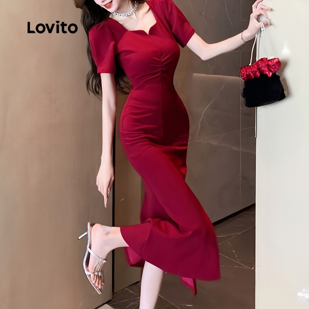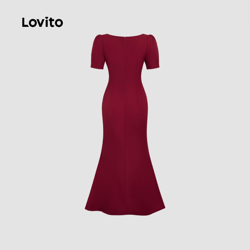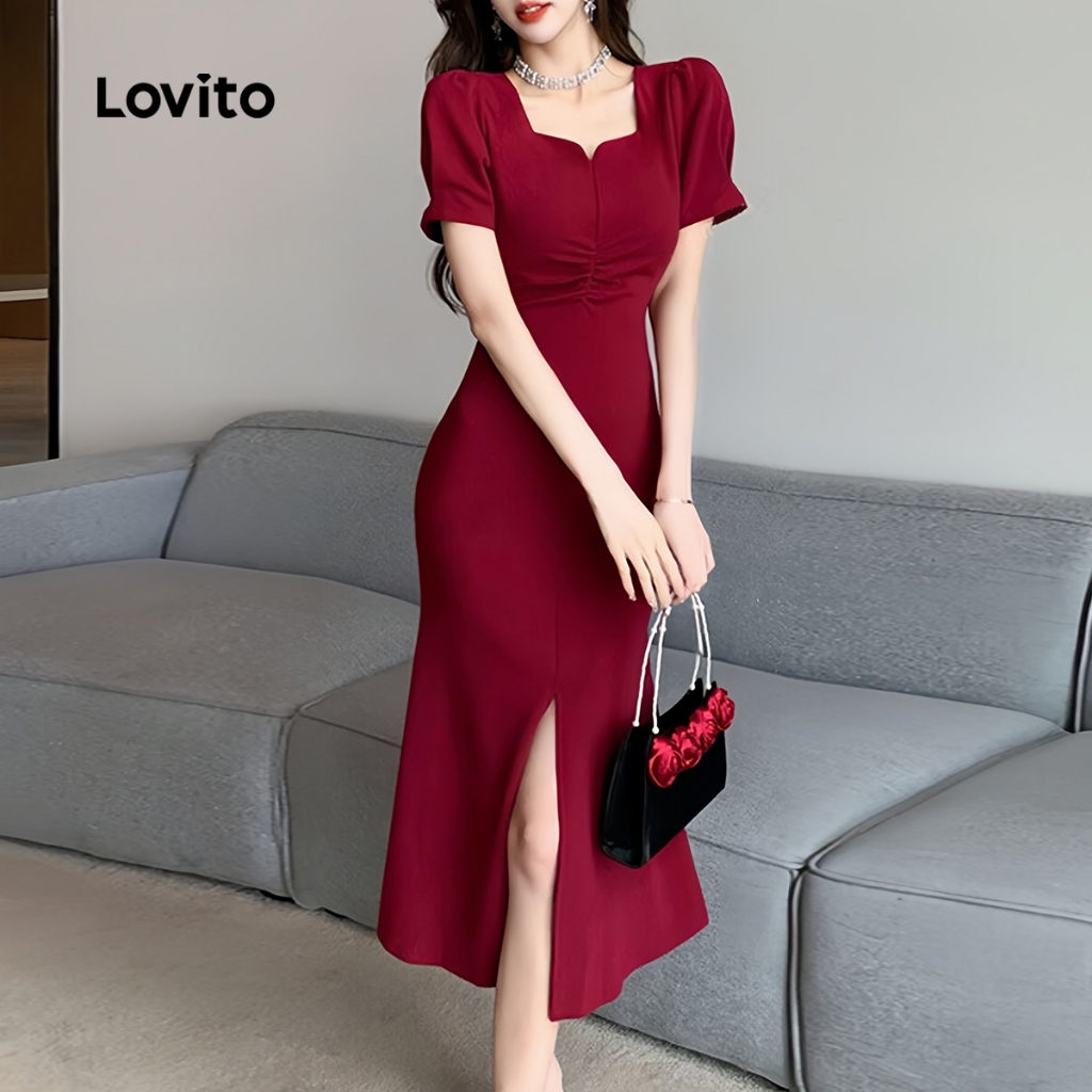 (NEW) Lovito Vestido Elegante com Fenda Frontal Primavera/verão Vermelho para Mulheres L155ED103