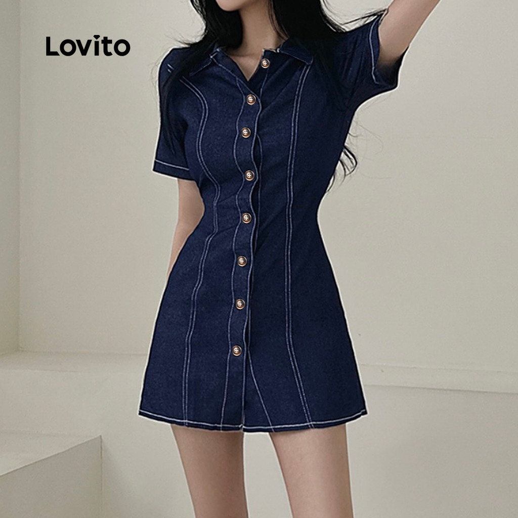 (New) Lovito Vestido Casual com Botões de Primavera/verão para Mulher em Azul Escuro L143AD654