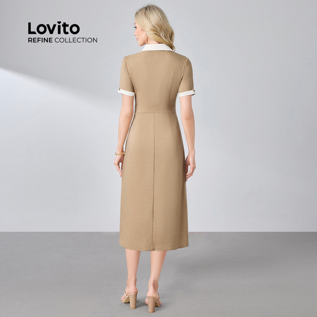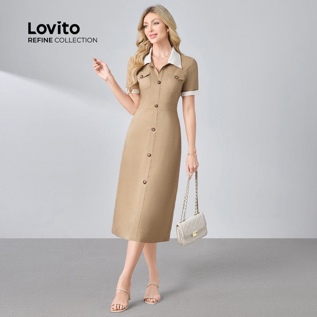 (Lovito Refine) Vestido Elegante com Botões Na Frente Costura de Tecido Primavera/verão Vestido cáqui LR23L140