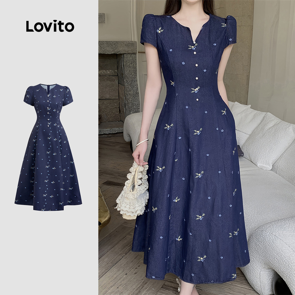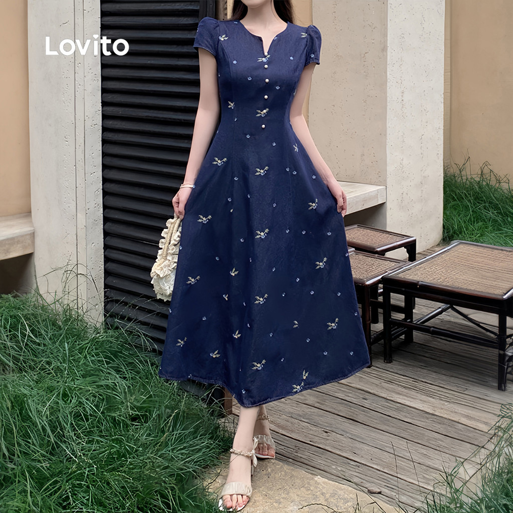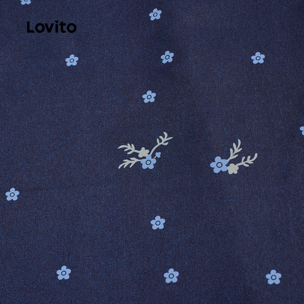 Lovito Vestido Elegante Casual Confortável E Estiloso Azul Marinho Primavera/verão Para Mulheres L150AD898