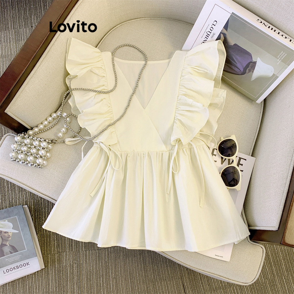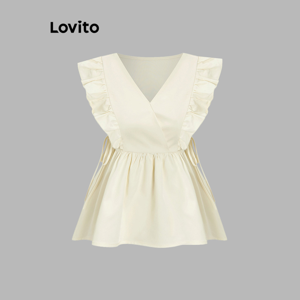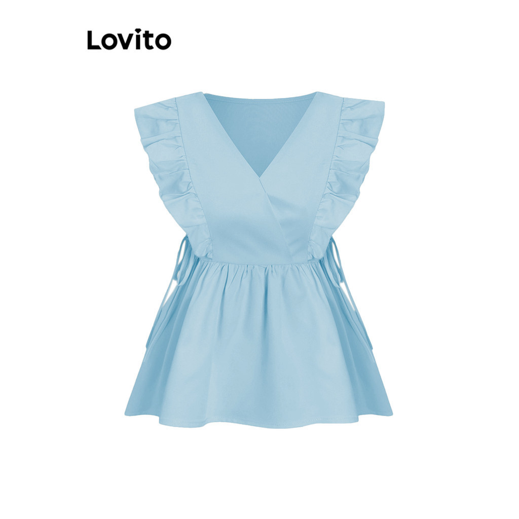 (Trendy2) Lovito Blusa Casual Lisa Com Cadarço E Acabamento Em Alface Para Mulheres L68ED004 (Multicolorido)