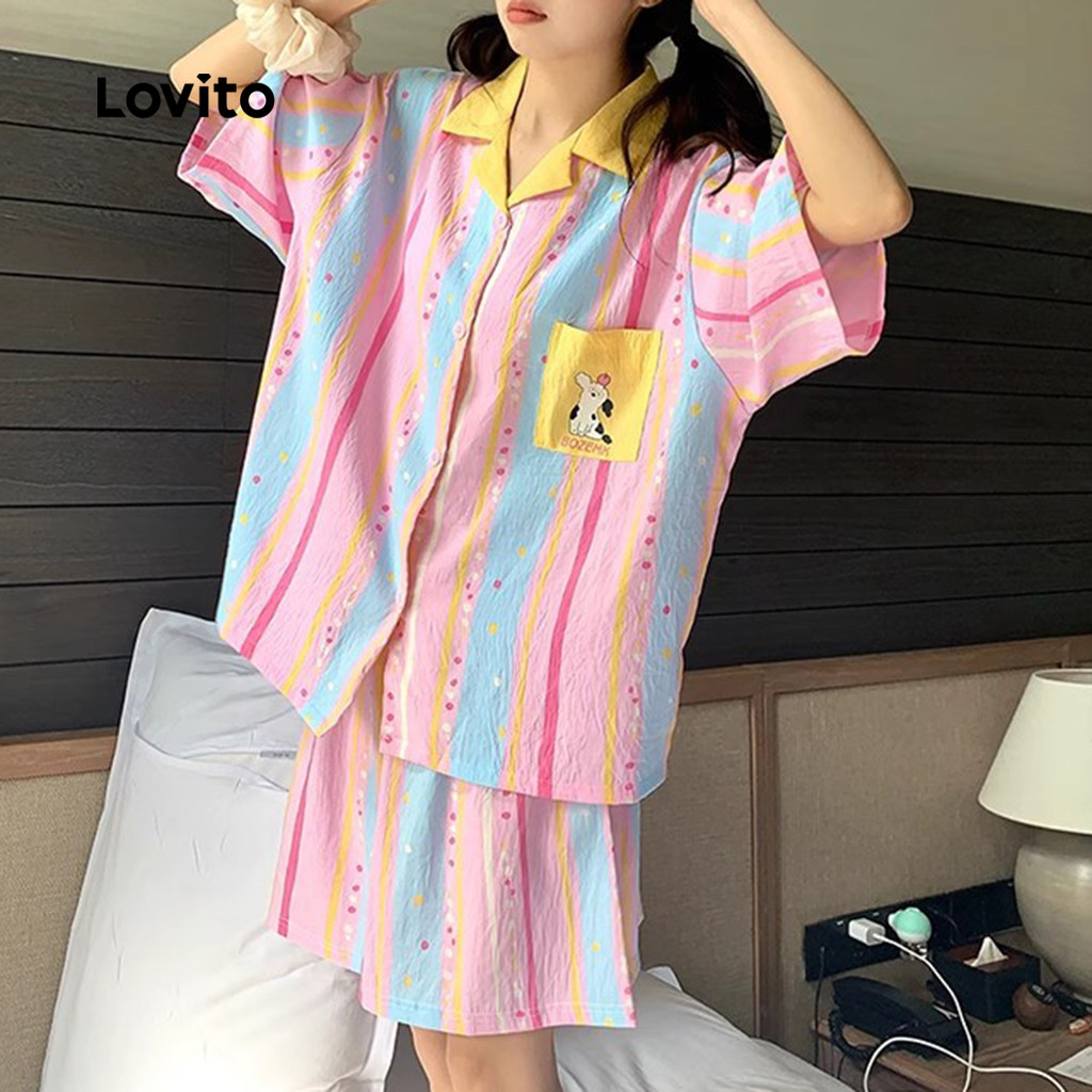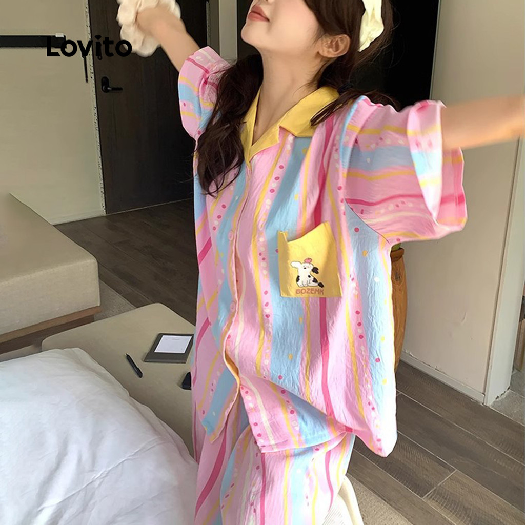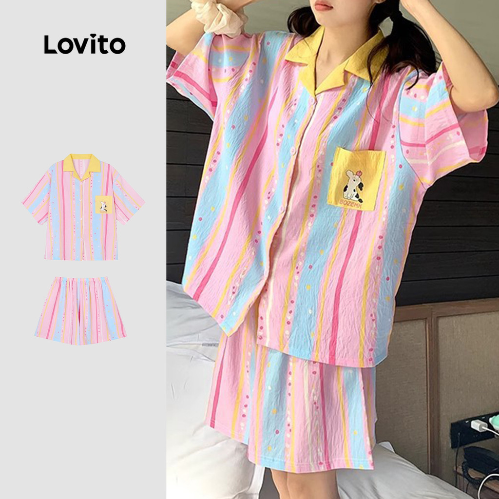 Lovito Conjunto De Pijama Fofo Com Blocos De Cores Para Primavera/Verão Para Mulheres Lna107X025\2