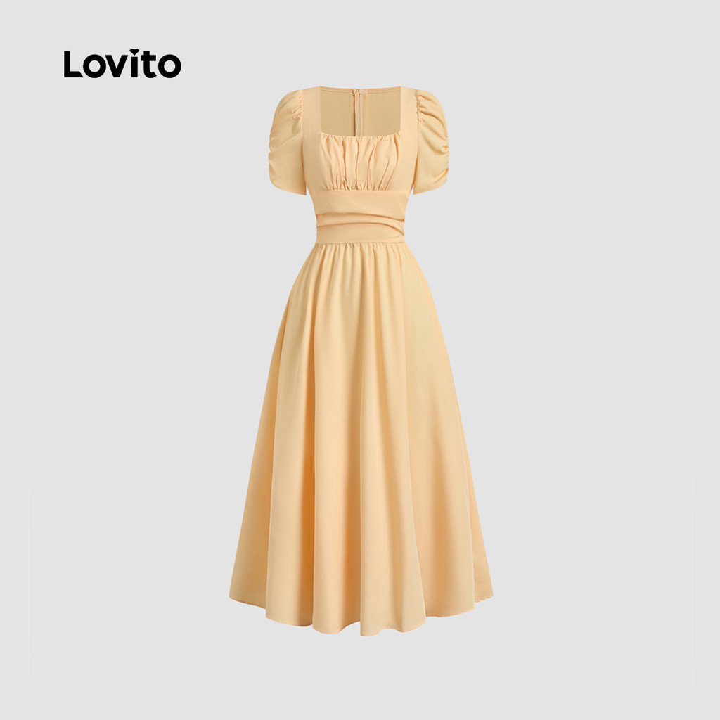 Lovito Vestido Feminino com Pregas, Textura Refinada, Amarelo, para Primavera/Verão, L137LD391