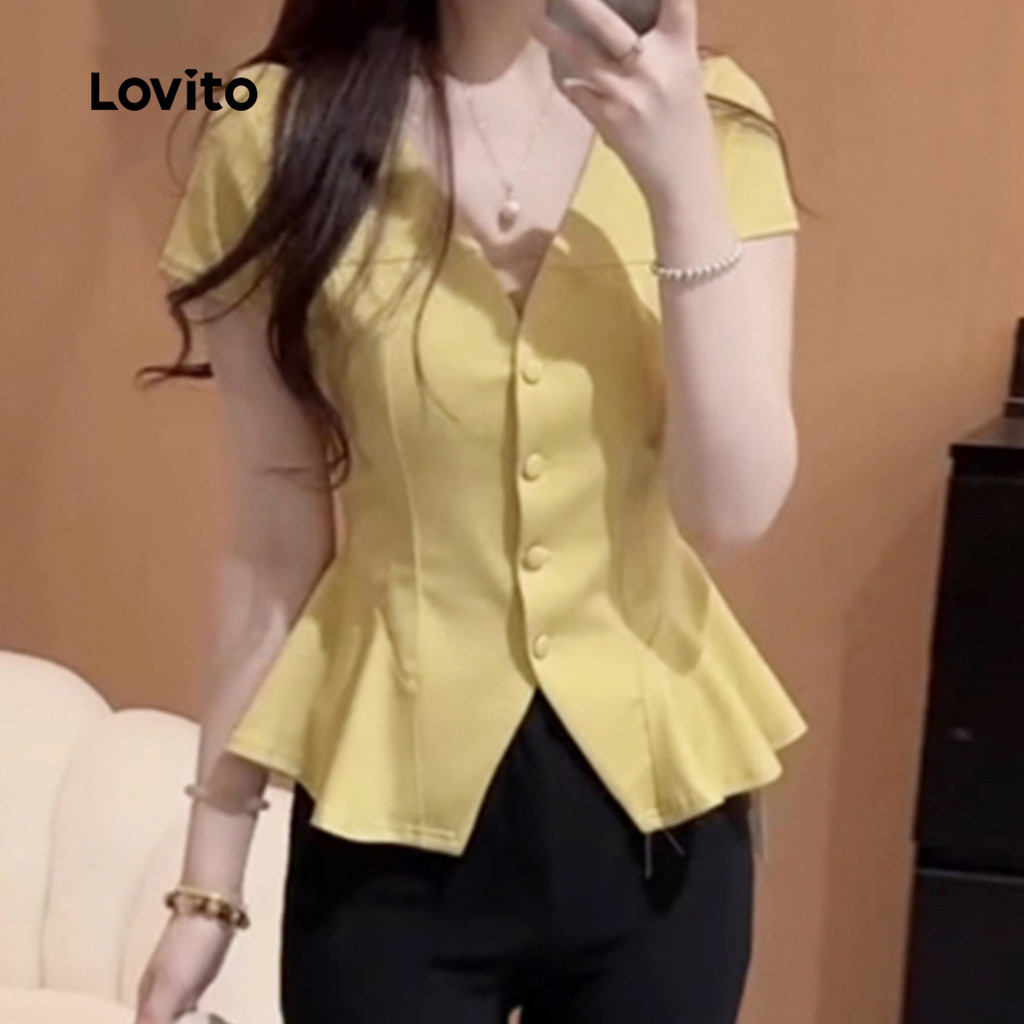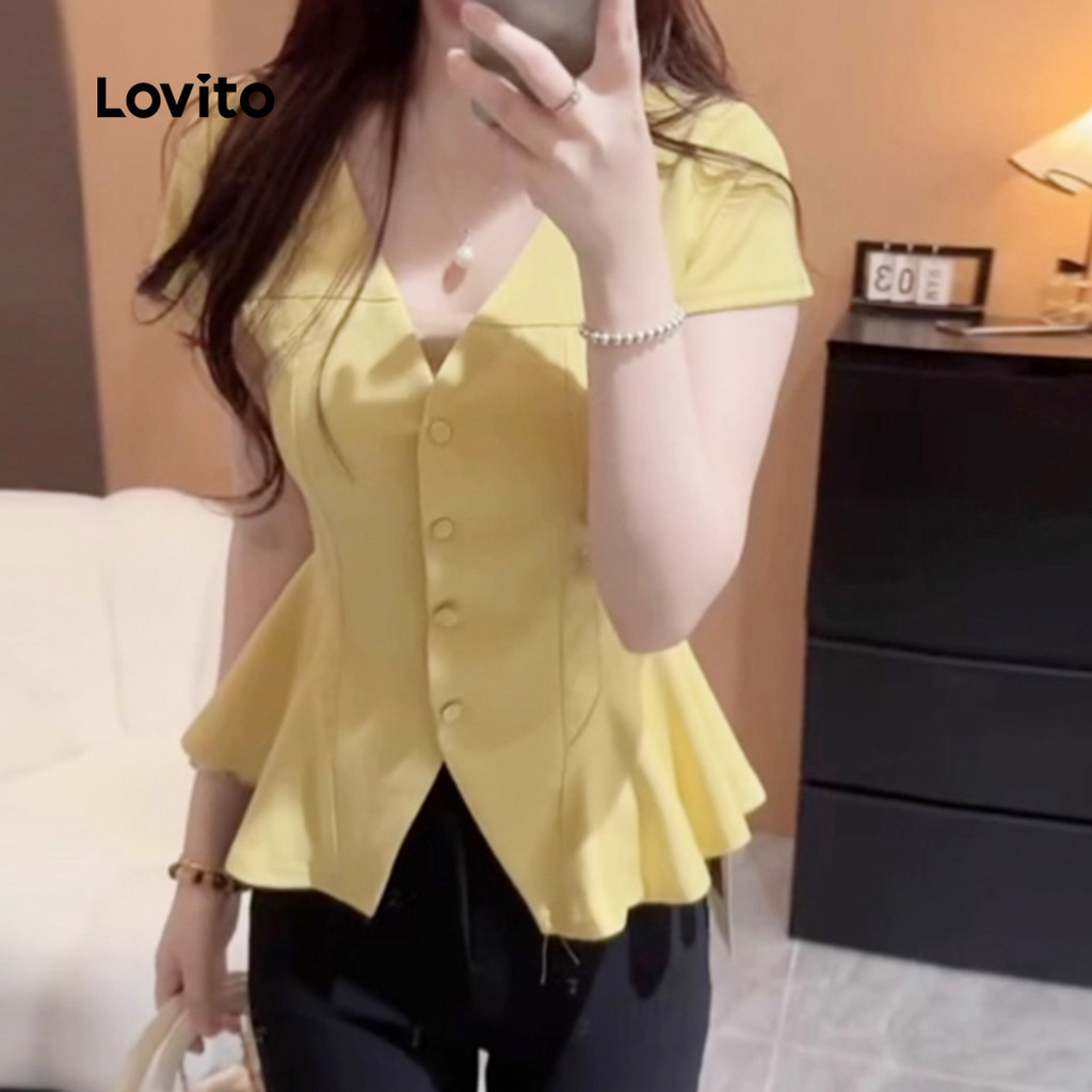 (New) Lovito Blusa Casual de Botão Frente Dividida Frente Primavera/verão Blusa Amarela para Mulheres L142ED617