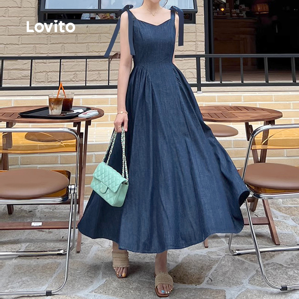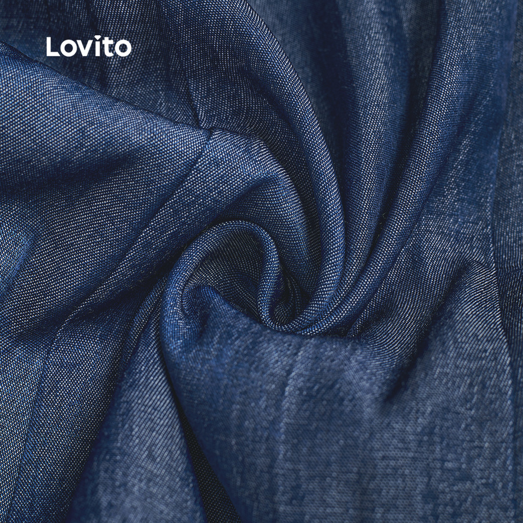 (New) Lovito Vestido Elegante de Jeans com Laços Pregas Primavera/verão Vestido de Jeans Azul para Mulheres L142LD122