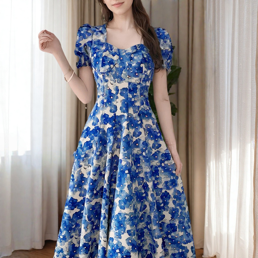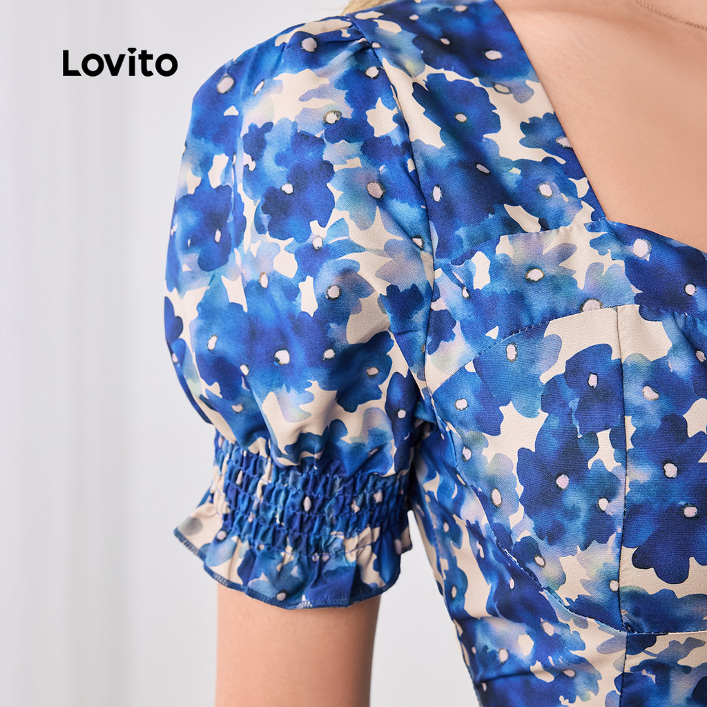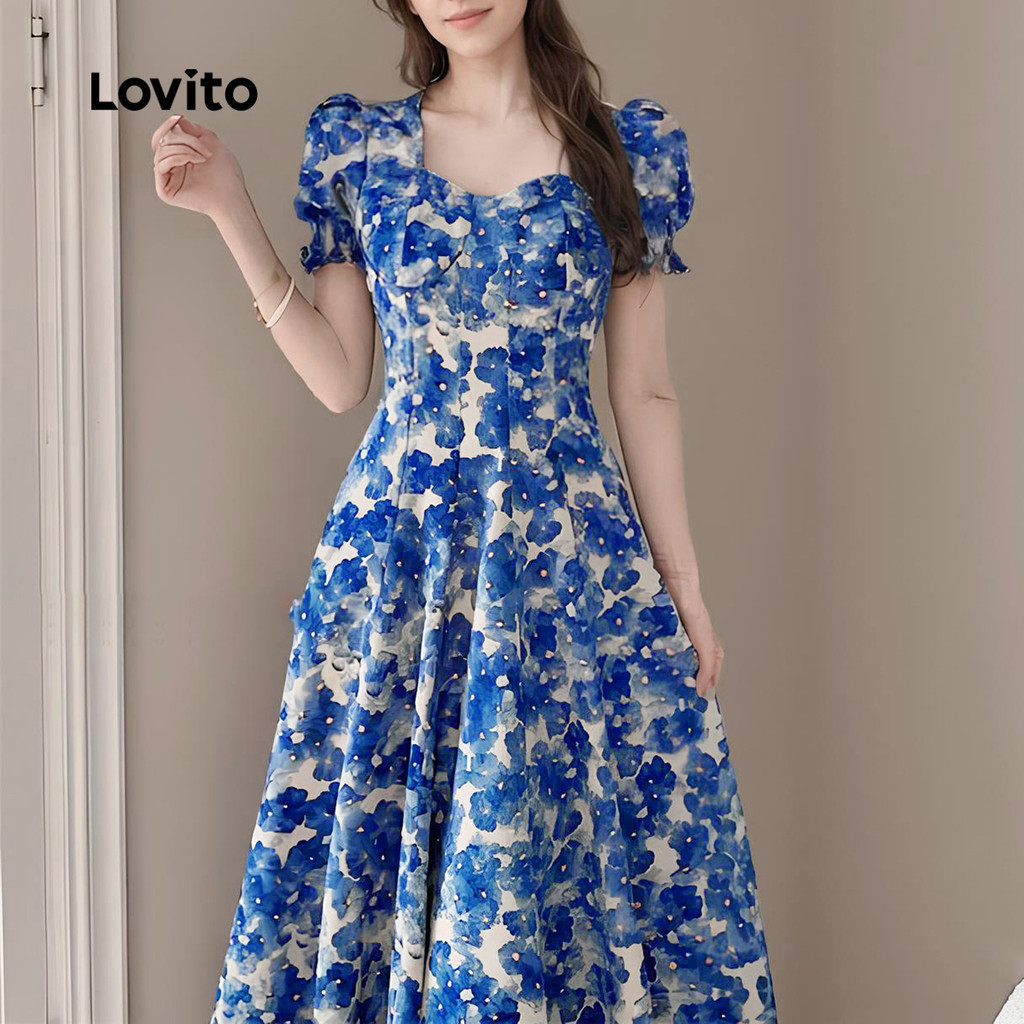 Lovito Vestido Azul Casual Com Estampa Floral E Zíper Plissado Primavera/verão Para Mulheres LBL25276