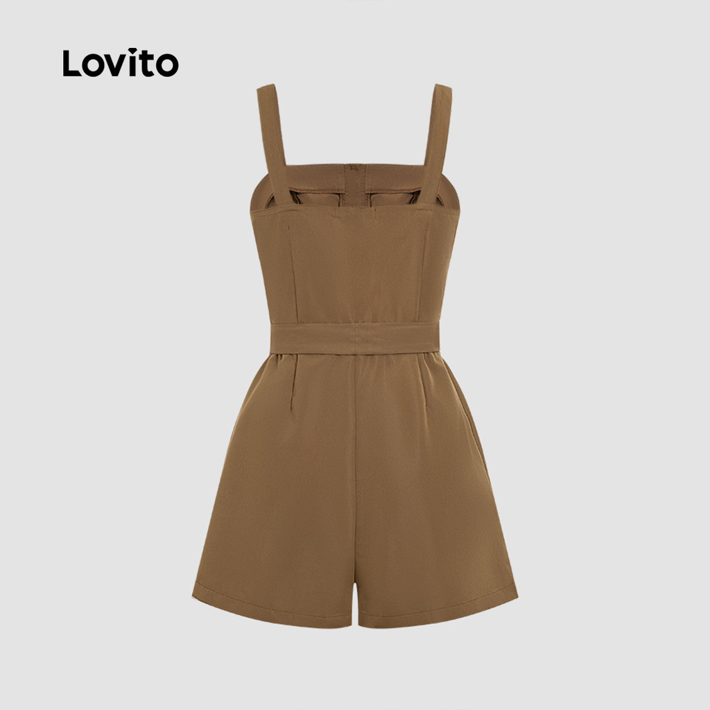 (NEW) Lovito Macacão Casual de Renda com Laço Botão Primavera/verão Castanho para Mulheres L155AD250
