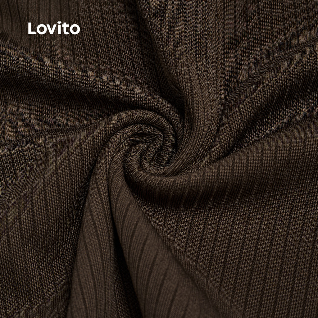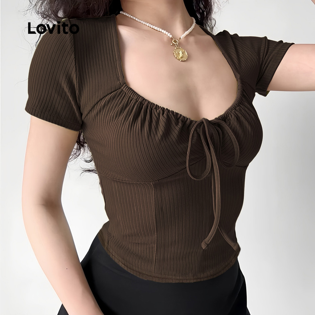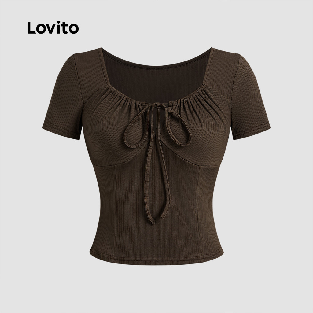 Lovito Camiseta Casual com Laço Na Frente e Franzido Boa Textura Primavera/verão Camiseta marrom L138ED170
