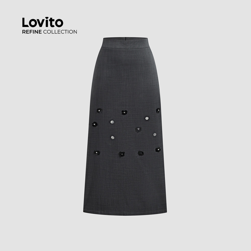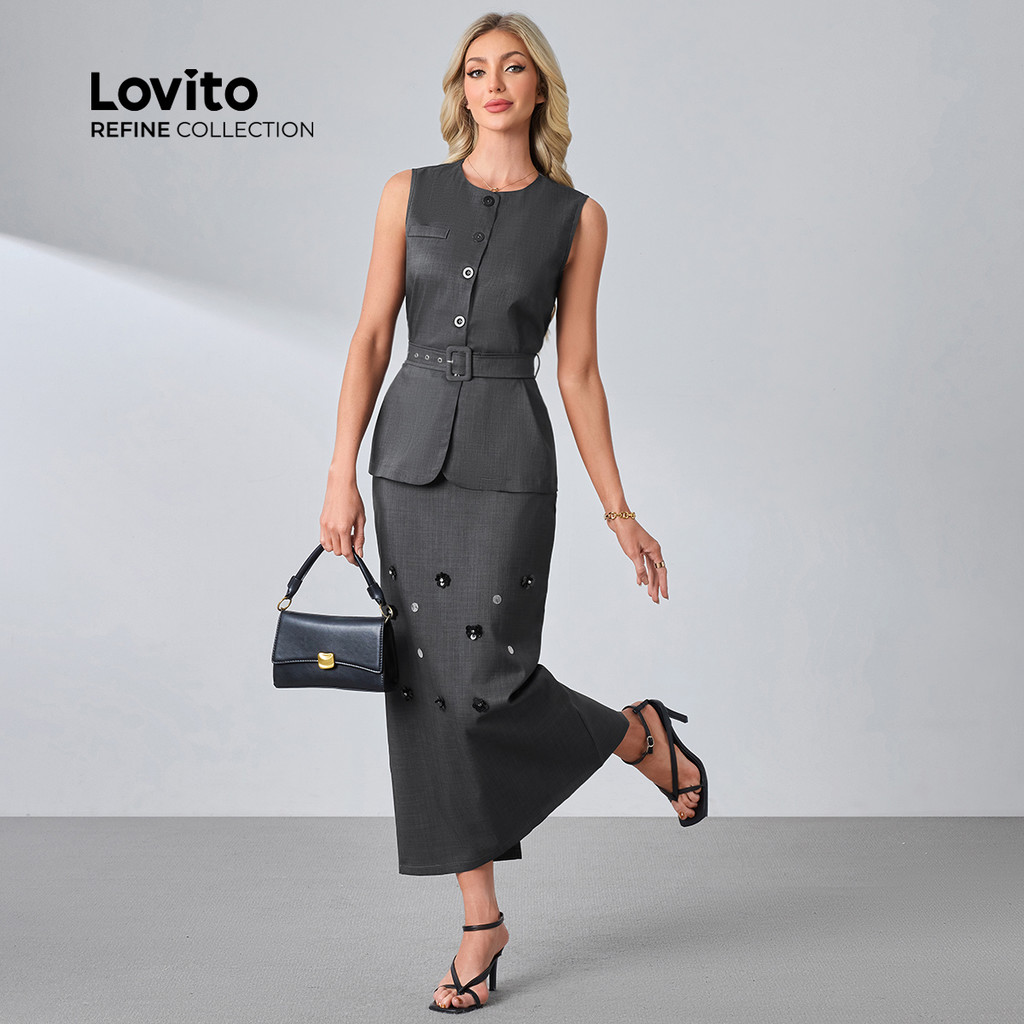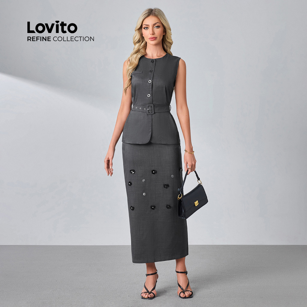 (lovito Refine) Conjunto Elegante Blusa Calça Luxo Eventos Sociais Cinto Cinza Escuro Primavera/verão Mulheres LR23L243