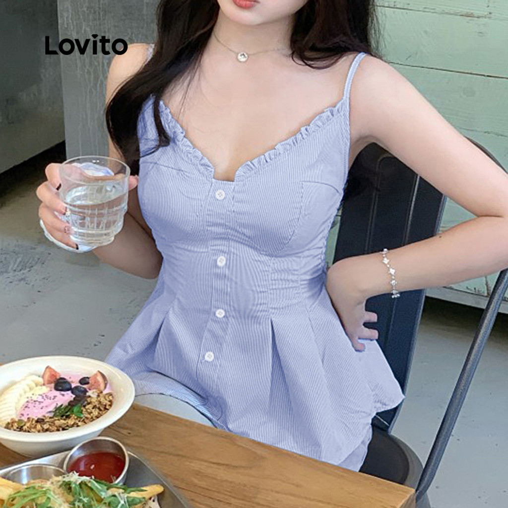 Lovito Blusa Casual de Primavera/verão com Pregas Babados e Azul para mulheres L149LD104