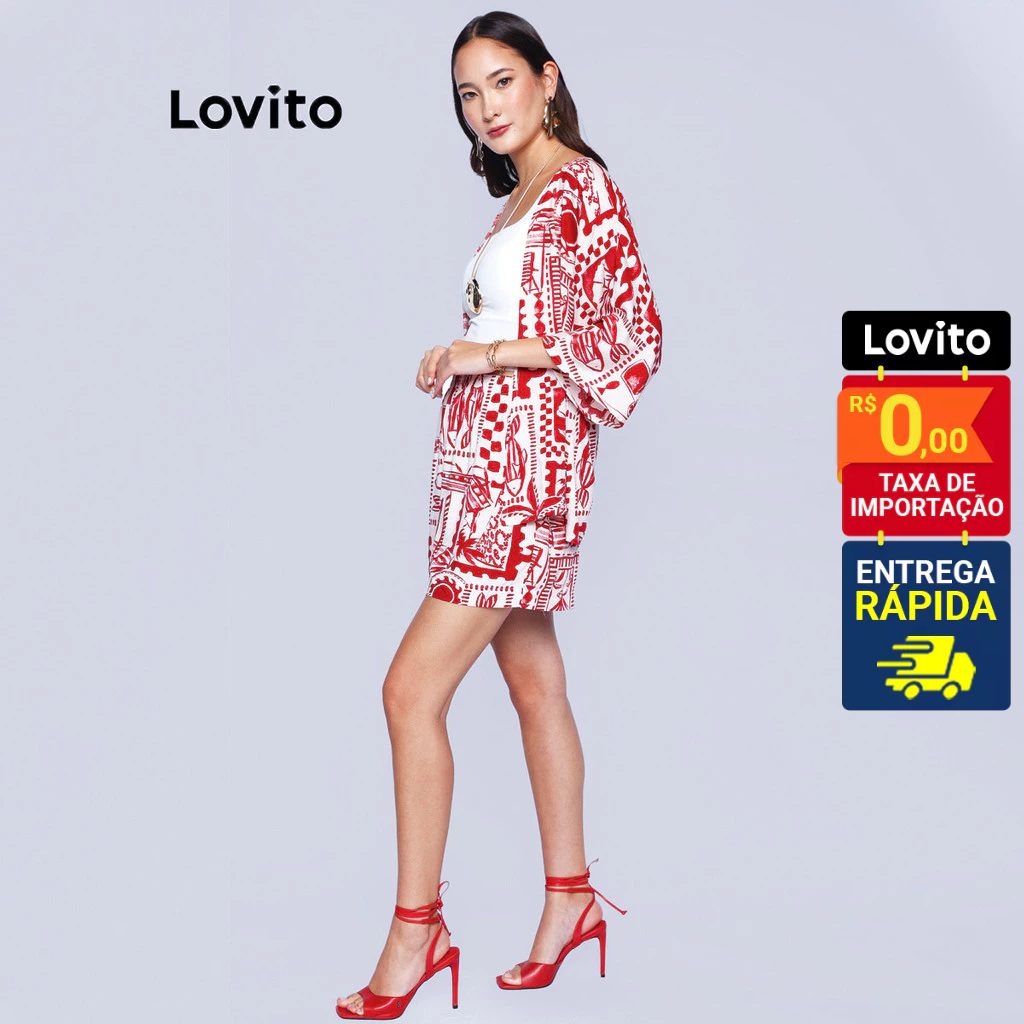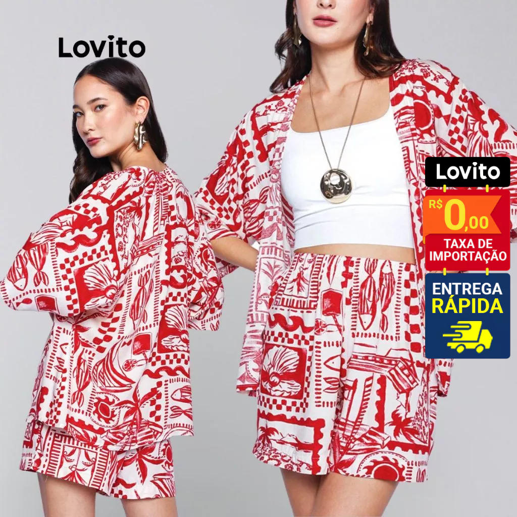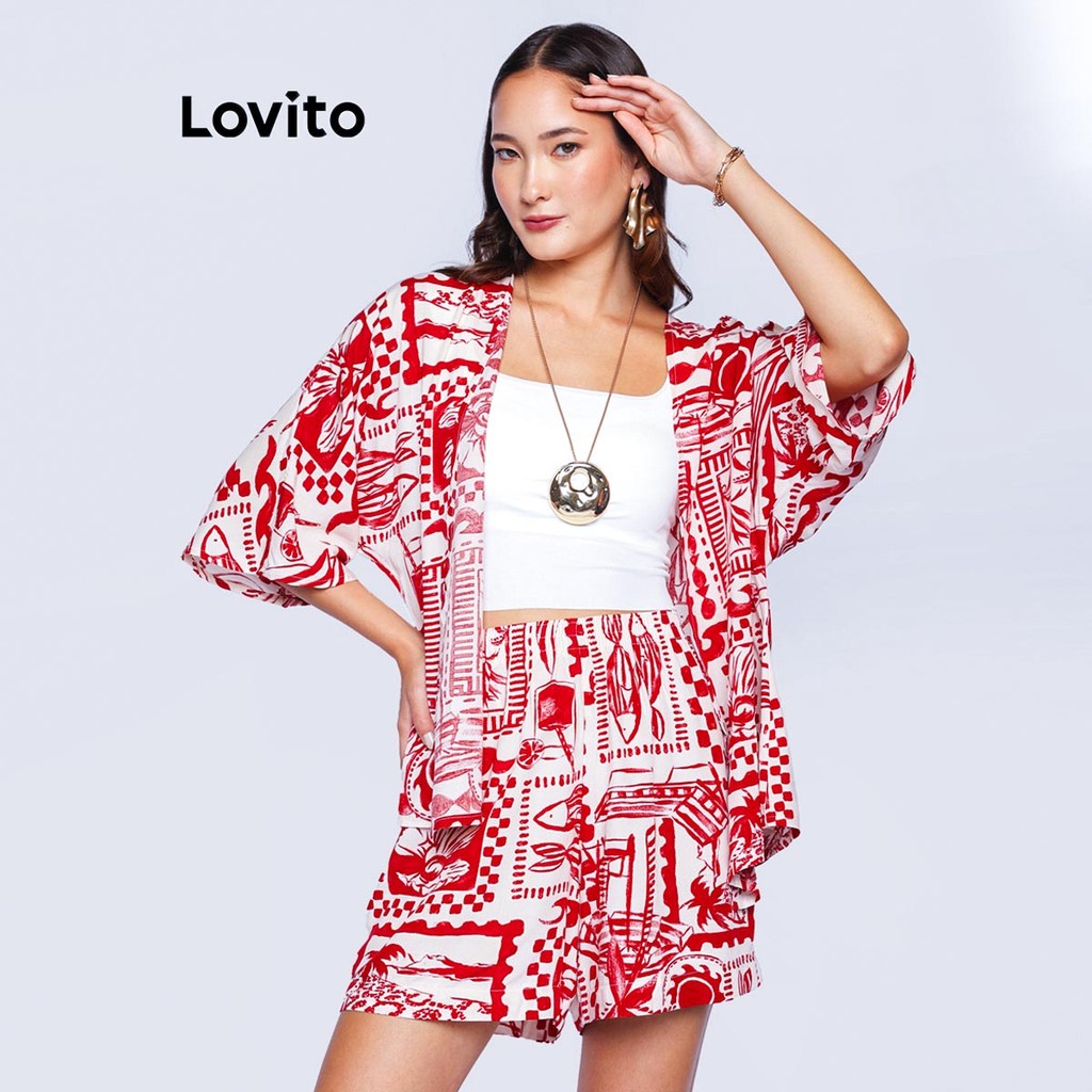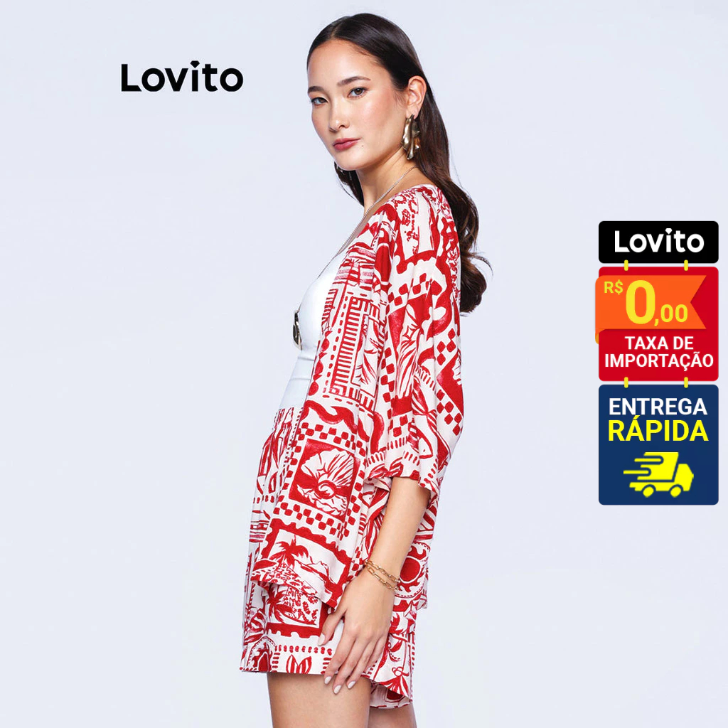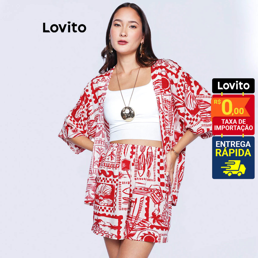 Lovito Bossa l Conjunto Feminino em Viscose de Shorts e Kimono Estampado Boho LB486BRL516