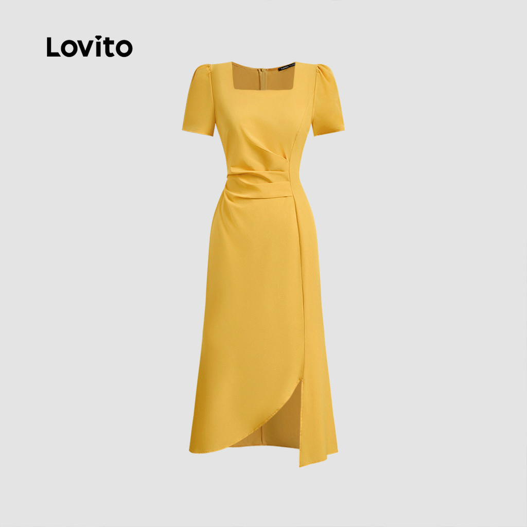 Lovito Vestido Elegante Assimétrico de Pregas Primavera/verão Vestido Leve Amarelo para Mulheres L154ED1138