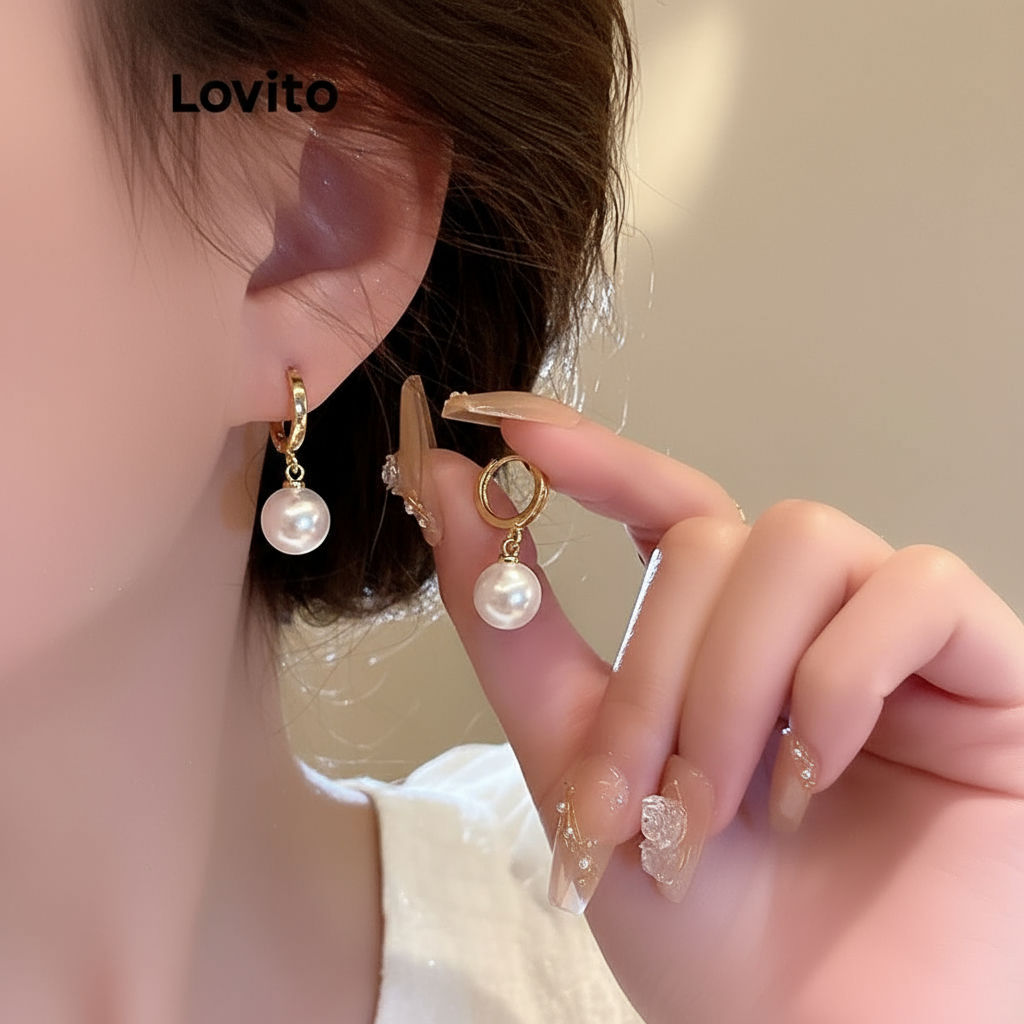 Lovito Brincos Femininos Lisos de Pérola para Uso Casual LFA02069 (Dourado)