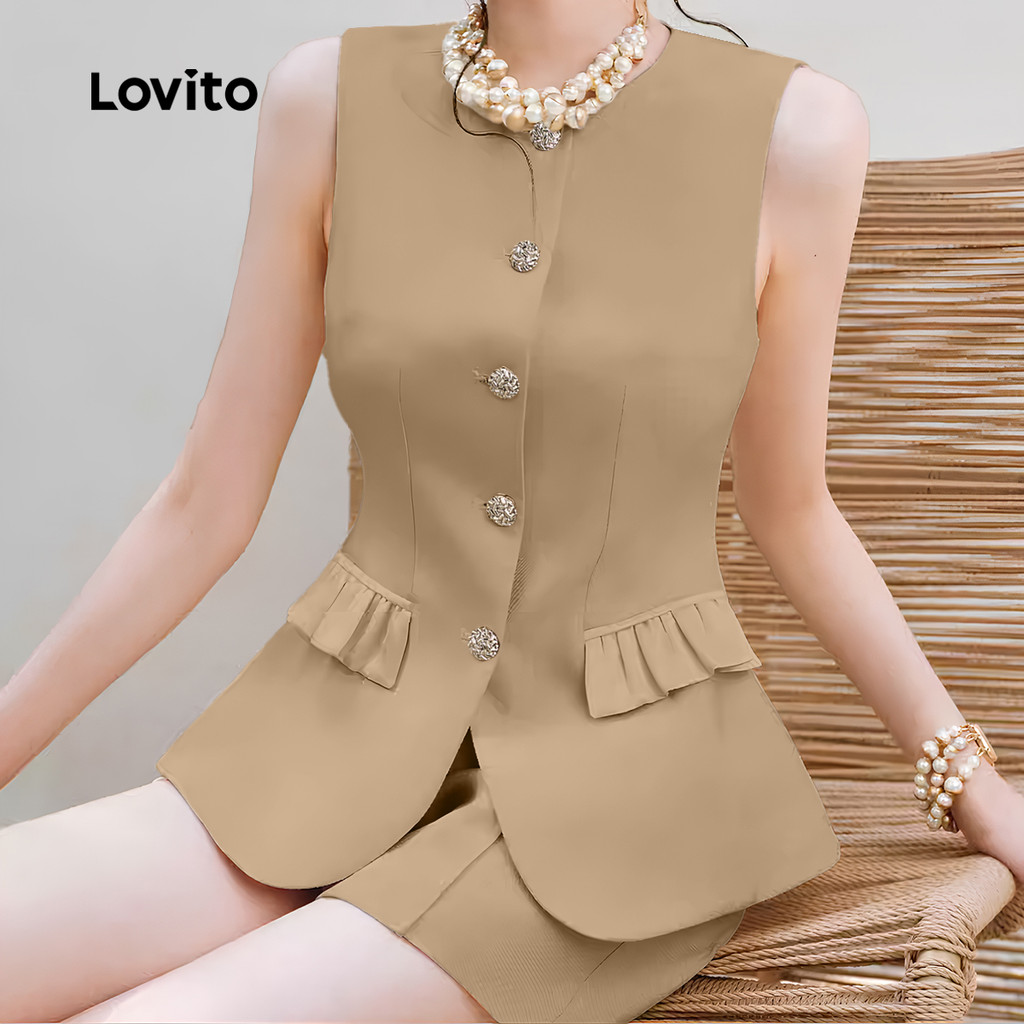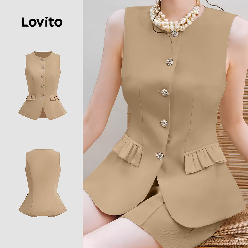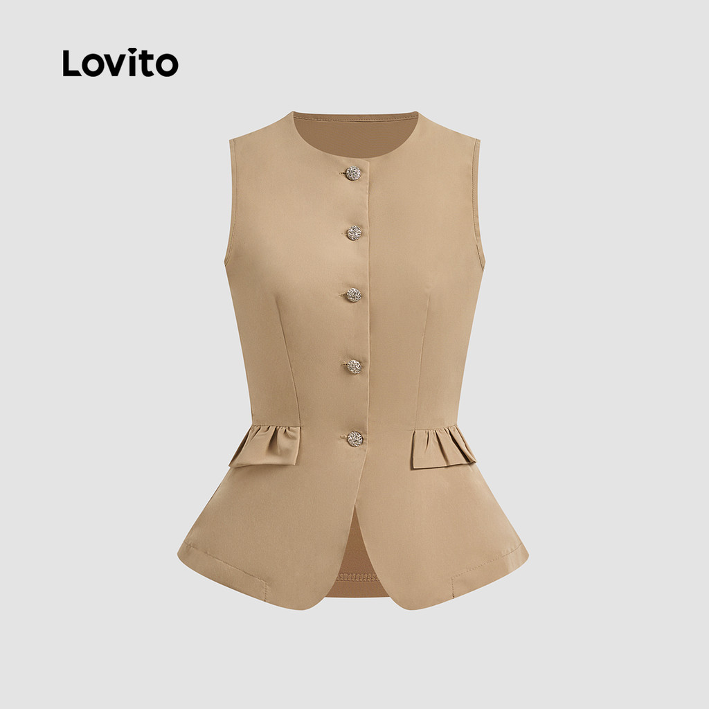 Lovito Blusa Elegante com Bolso Falso Botão Primavera/verão Blusa Caqui para Mulheres L142LD433