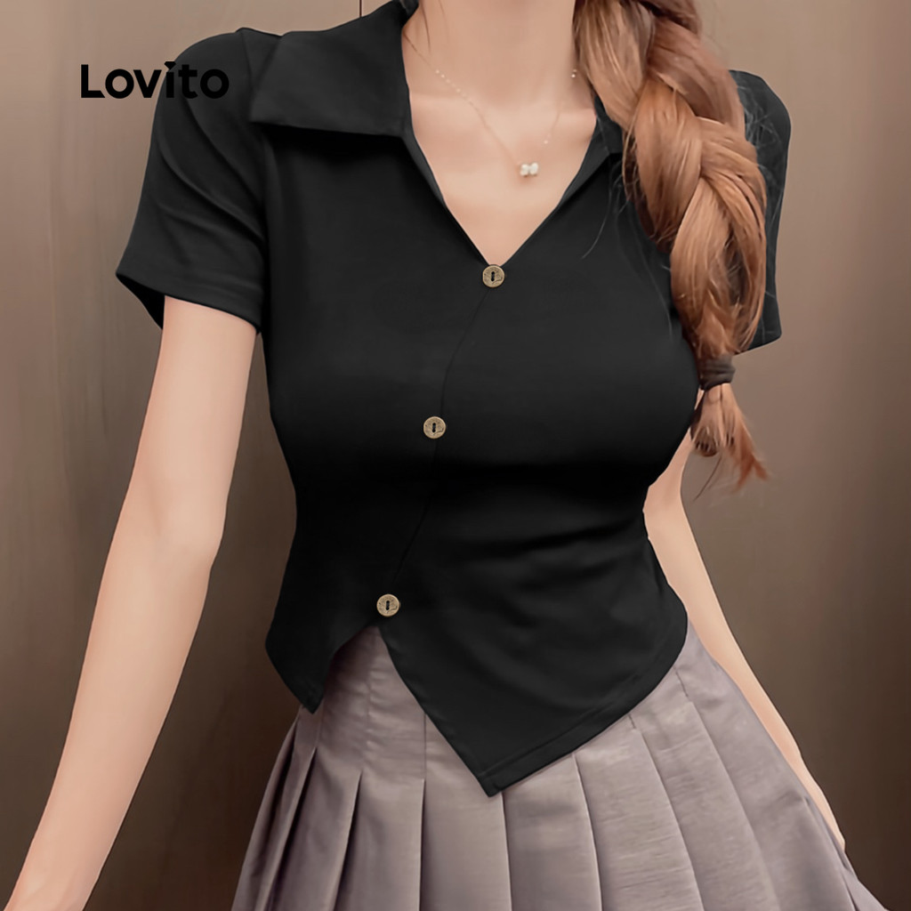 Lovito Camiseta Preta Casual Lisa Assimétrica Com Botão Primavera/Verão Para Mulheres L134ED076