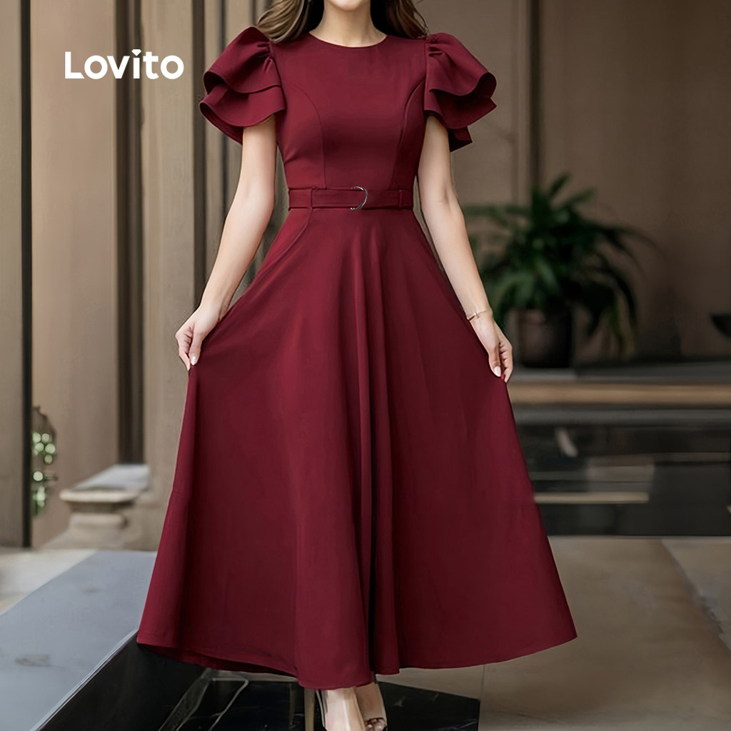 Lovito Vestido Feminino com Cinto Duplo, Elegância para Primavera e Verão, Cor Vinho, L155ED434