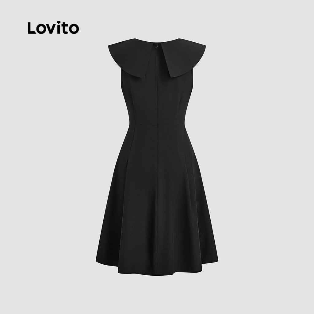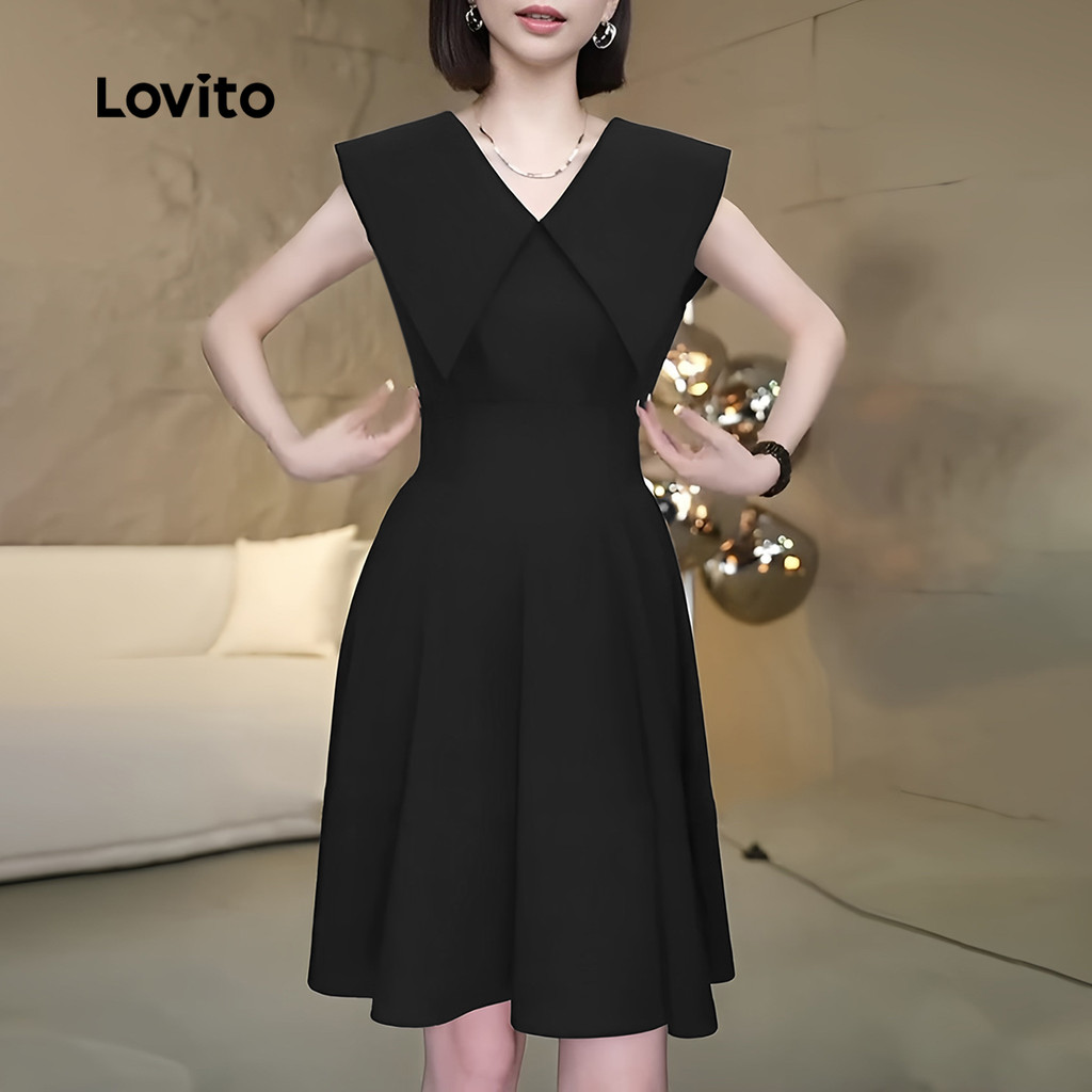 Lovito Vestido Elegante de Rua Simples e Retrô para Primavera/verão Preto para Mulheres L142ED205