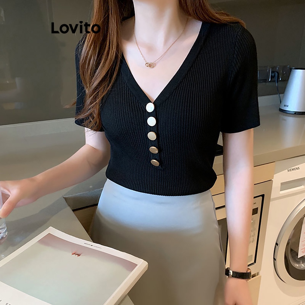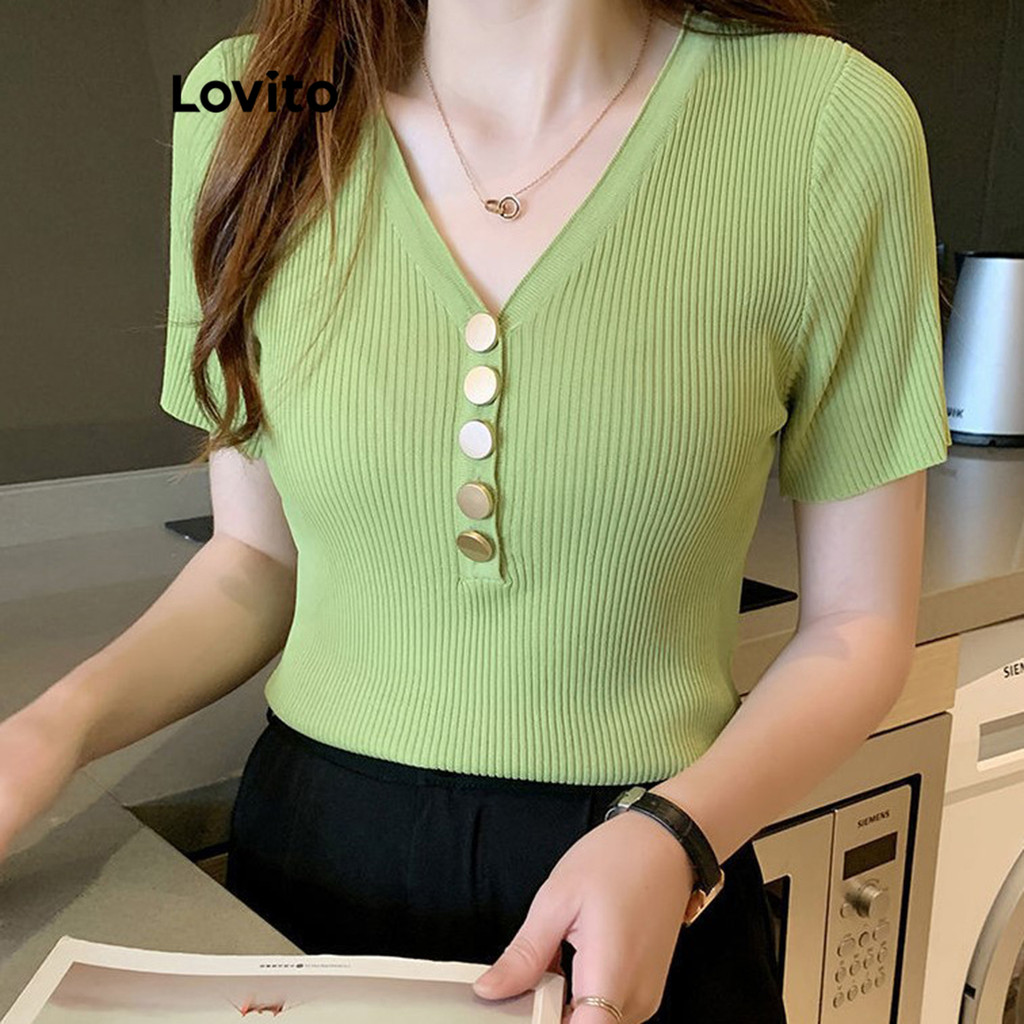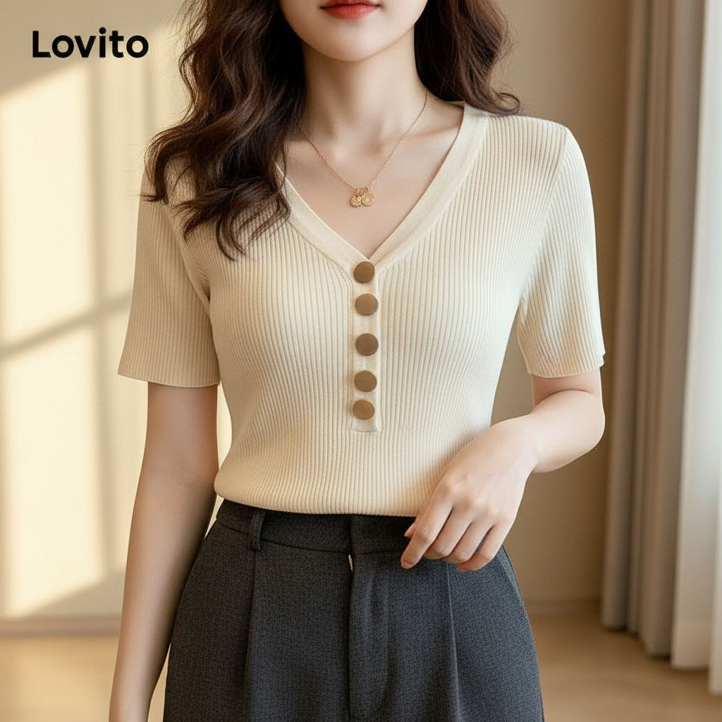 Camiseta Feminina Casual com Botão Lovito para Verão/Primavera LNL36064