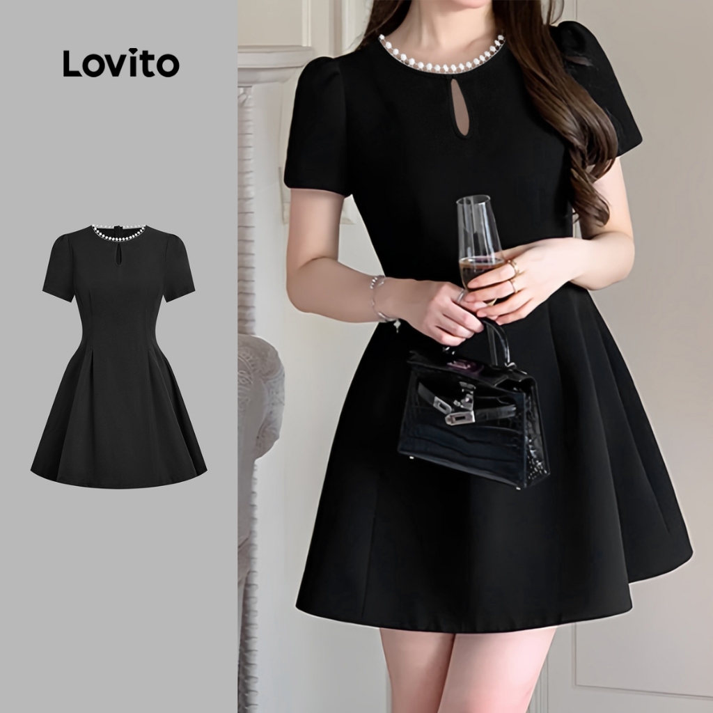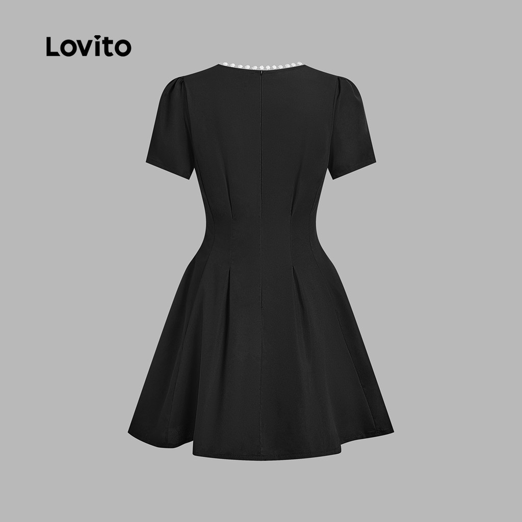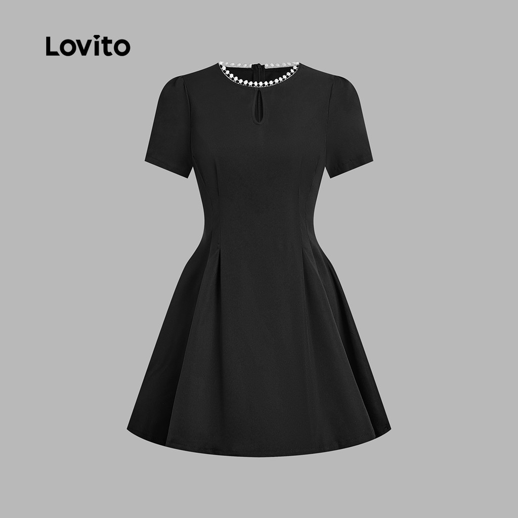 Lovito Vestido Fofo de Renda com Aberturas Pregas Fresco e Confortável Verão/primavera preto L139AD235