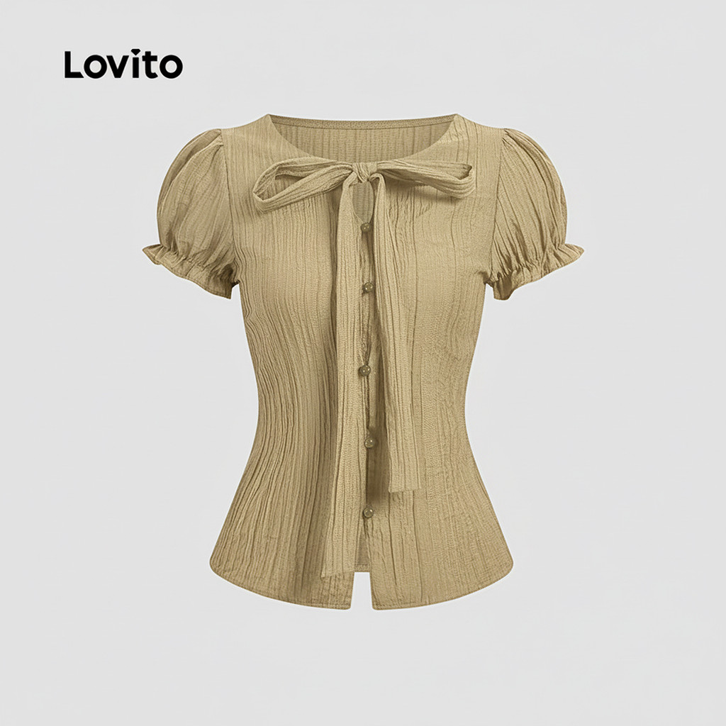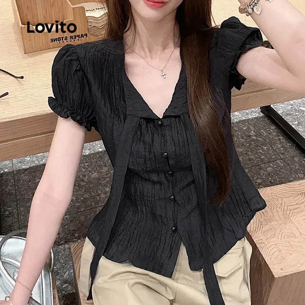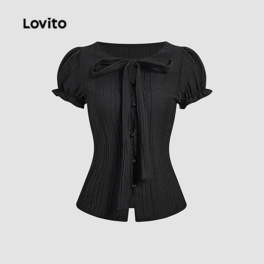 Lovito Blusa Casual com Laço No Pescoço Botões Primavera/verão Blusa Preta para mulher L154LD116