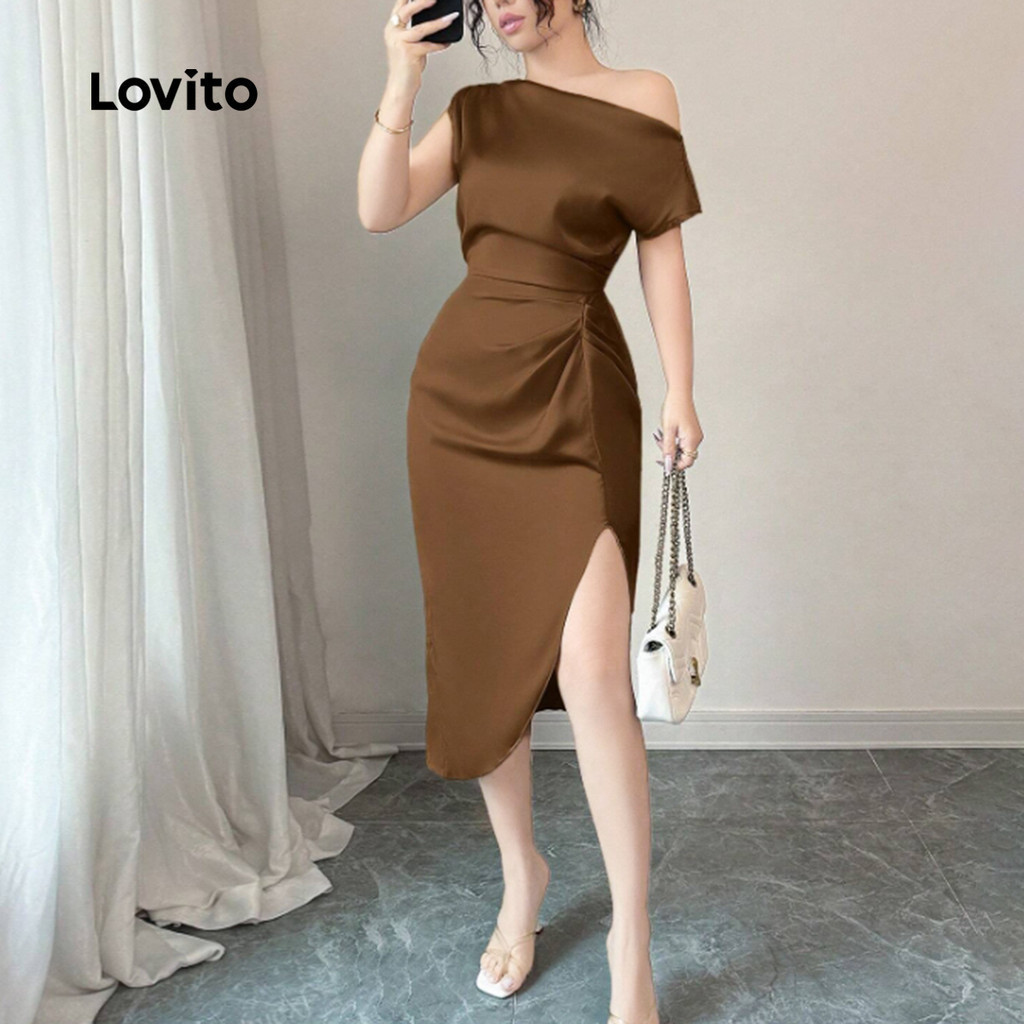 Lovito Vestido Glamoroso Marrom Com Pregas E Zíper Para Mulheres Ideal Para O Verão/primavera L155AD343